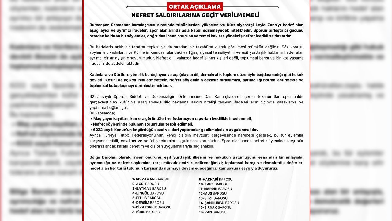 “Bursaspor-Somaspor karşılaşması sırasında tribünlerden yükselen ve Kürt siyasetçi Leyla Zana'yı hedef alan aşağılayıcı ve ayrımcı ifadeler, spor alanlarında asla kabul edilemeyecek niteliktedir. Sporun birleştirici gücünü ortadan kaldıran bu söylemler, doğrudan insan onuruna ve temel haklara yönelmiş nefret içerikli saldırılardır.