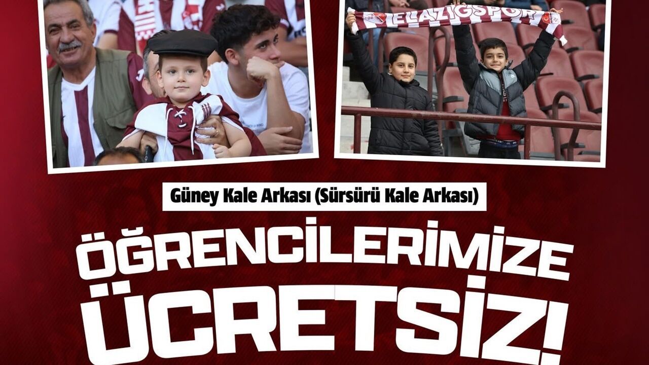 TFF 2. Lig Beyaz Grup’un 28. Haftası’nda Şanlıurfaspor’u konuk edecek olan Elazığspor’da yönetim kurulu kararıyla kale arkası tribün biletleri 17 yaş altı öğrencilere ücretsiz yapıldı. Elazığspor Kulübü’nden yapılan açıklamada; "Haydi gençler, yeriniz hazır. Güney Kale Arkası (Sürsürü Kale Arkası) Tribünü, 17 yaş ve altındaki öğrenciler için ücretsizdir. Öğrenciler, öğrenci kimlik kartlarını stadyum girişindeki görevlilere göstererek davetiyelerini ücretsiz alıp maça giriş yapabileceklerdir" denildi.