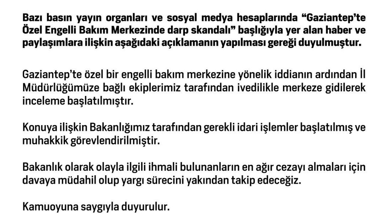 Bakanlığın konuya ilişkin sosyal medya hesabından yaptığı paylaşımda, "Bazı basın yayın organları ve sosyal medya hesaplarında ‘Gaziantep’te Özel Engelli Bakım Merkezinde darp skandalı’ başlığıyla yer alan haber ve paylaşımlara ilişkin aşağıdaki açıklamanın yapılması gereği duyulmuştur. Gaziantep’te özel bir engelli bakım merkezine yönelik iddianın ardından İl Müdürlüğümüze bağlı ekiplerimiz tarafından ivedilikle merkeze gidilerek inceleme başlatılmıştır. Konuya ilişkin Bakanlığımız tarafından gerekli idari işlemler başlatılmış ve muhakkik görevlendirilmiştir. Bakanlık olarak olayla ilgili ihmali bulunanların en ağır cezayı almaları için davaya müdahil olup yargı sürecini yakından takip edeceğiz" ifadeleri kullanıldı.