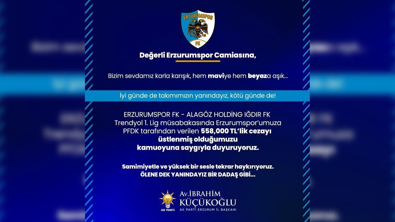 “Değerli Erzurumspor camiasına, Bizim sevdamız karla karışık, hem maviye hem beyaza aşık. İyi günde de takımımızın yanındayız, kötü günde de! Erzurumspor Fk - Alagöz Holding Iğdır Fk 1. Lig müsabakasında Erzurumspor'umuza PFDK tarafından verilen 558,000 TL'lik cezayı üstlenmiş olduğumuzu kamuoyuna saygıyla duyuruyoruz. Samimiyetle ve yüksek bir sesle tekrar haykırıyoruz. Ölene dek yanındayız bir dadaş gibi.”