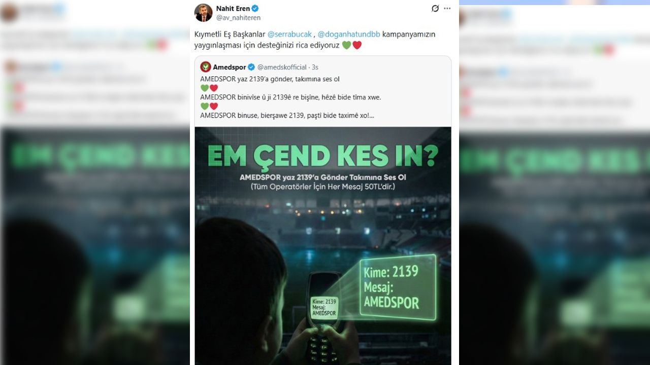 Kulüp yönetimi, taraftarların büyük ilgi gösterdiği kampanyanın şehrin tüm kurumları tarafından sahiplenilmesi halinde çok daha güçlü bir karşılık bulacağını belirtiyor. Amedspor, taraftarlarını tüm GSM operatörlerinden AMEDSPOR yazarak 2139’a SMS gönderme çağrısını yineledi.