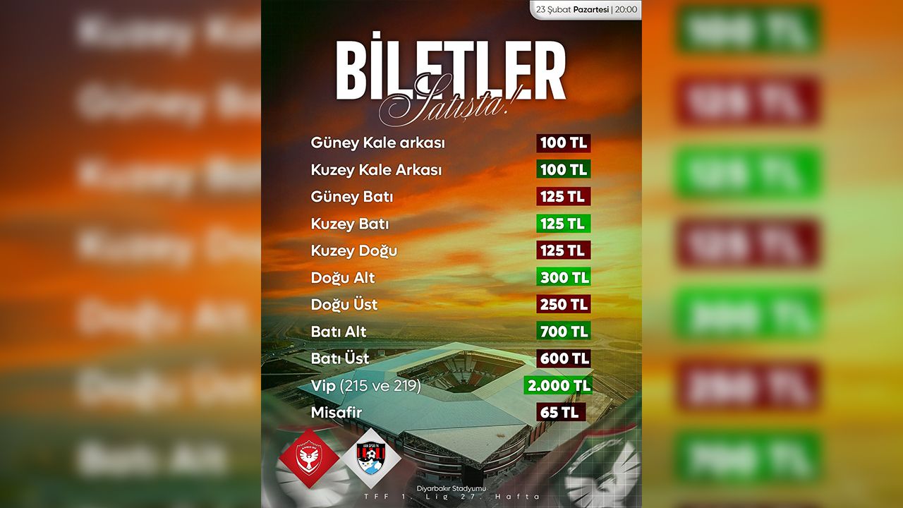 Amedspor Kulübünden yapılan yazılı açıklamaya göre bilet fiyatları şöyle oluştu:
