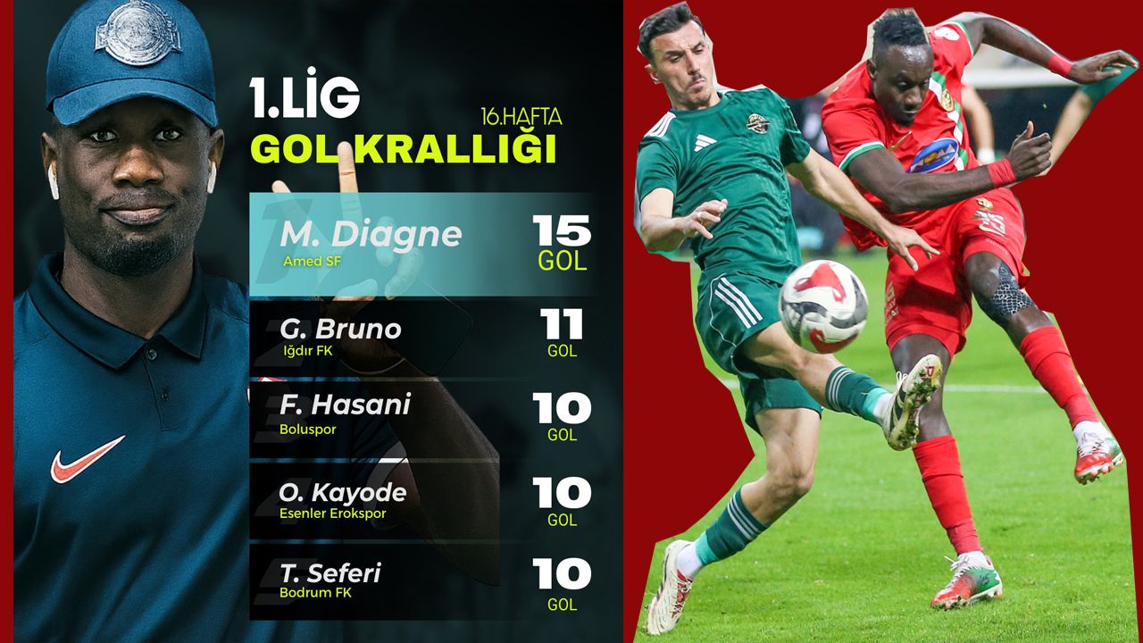 Ligde çıktığı maçlarda rakip savunmalara korku salan Diagne, attığı 15 golle gol krallığı yarışında zirvede yer alıyor. En yakın takipçisi Iğdırspor’un golcüsü Bruno’nun 4 gol önünde bulunan tecrübeli forvet Diagne'yi takip eden golcüler, takımları ve attıkları gol sayısı ise şöyle;