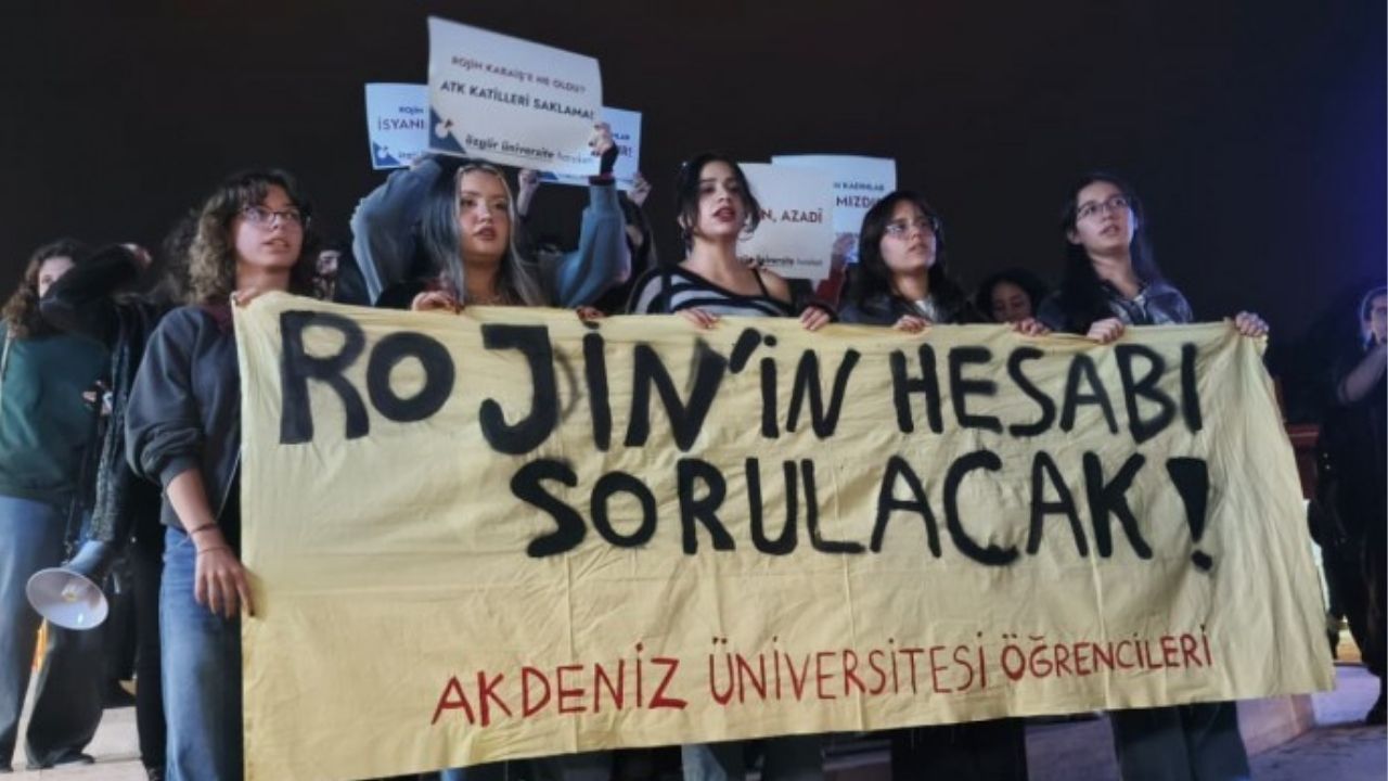 Antalya’daki Akdeniz Üniversitesi öğrencileri, 27 Eylül 2024’te kaybolduktan 18 gün sonra cansız bedeni Van Gölü kıyısında bulunan 21 yaşındaki Van Yüzüncü Yıl Üniversitesi öğrencisi Rojin Kabaiş için Konyaaltı ilçesinde bulunan Olbia Çarşı’da eylem yaptı.
