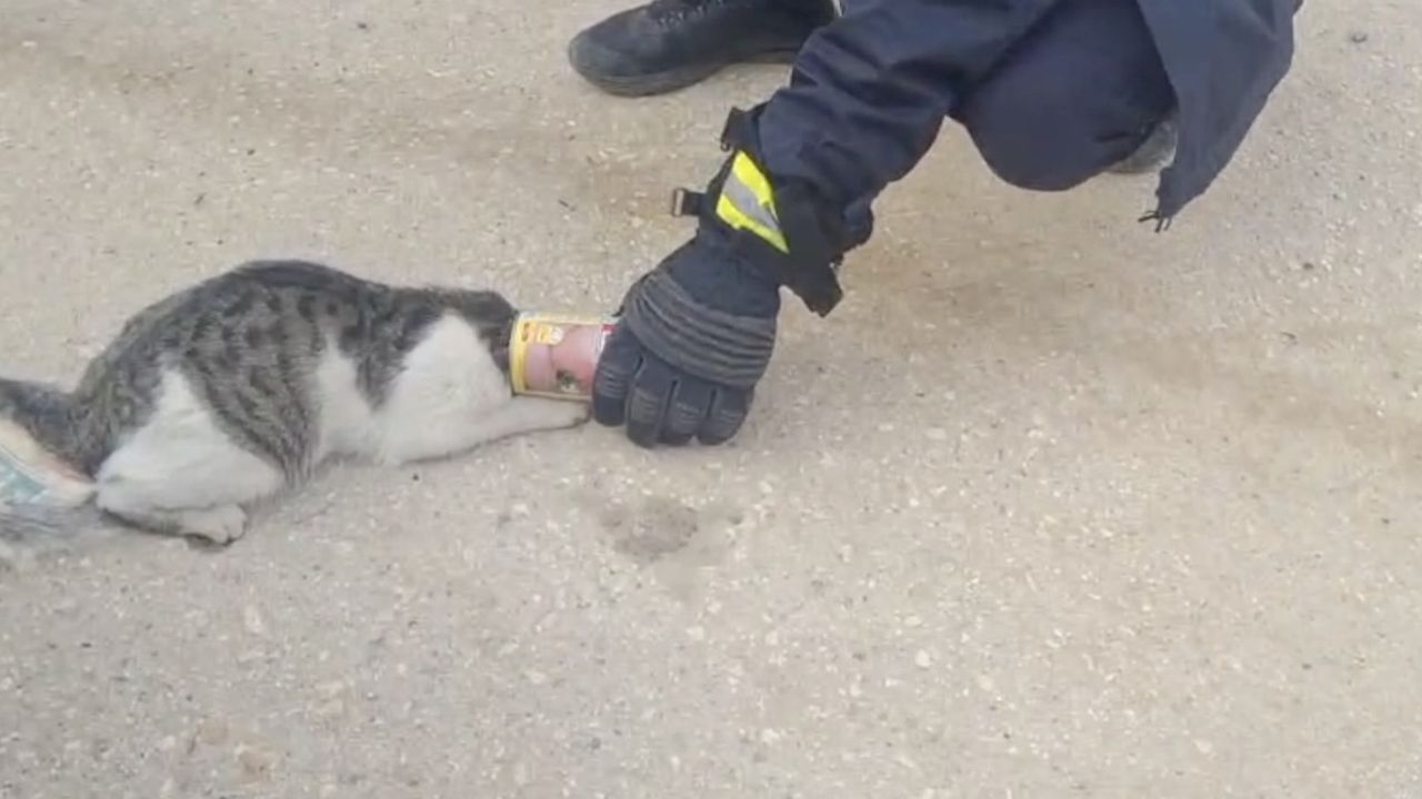 Ekipler, pense ve çeşitli ekipmanlarla kedinin başını sıkıştığı konserve kutusundan çıkardı.