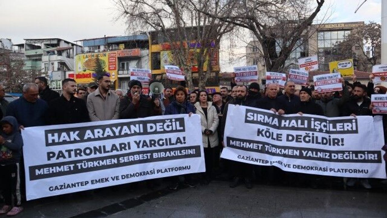 Antep Emek ve Demokrasi Platformu, Başpınar Organize Sanayi Bölgesi’nde (OSB) bulunan Sırma Halı fabrikasında direniş sergileyen işçilerle dayanıştığı gerekçesiyle tutuklanan Birleşik Tekstil Dokuma ve Deri İşçileri Sendikası (BİRTEK-SEN) Genel Başkanı Mehmet Türkmen’e ilişkin basın açıklaması gerçekleştirdi. Şahinbey ilçesinde bulunan Balıklı Meydanı’nda yapılan açıklamaya; platform bileşeni sendikalar, siyasi parti temsilcileri ve çok sayıda yurttaş katıldı. "Baskılar bizi yıldıramaz", "Mehmet Türkmen yalnız değildir" ve "Yaşasın sınıf dayanışması" sloganlarının atıldığı açıklamada platform adına basın metnini Haber-Sen Genel Başkanı Mesut Balcan okudu.