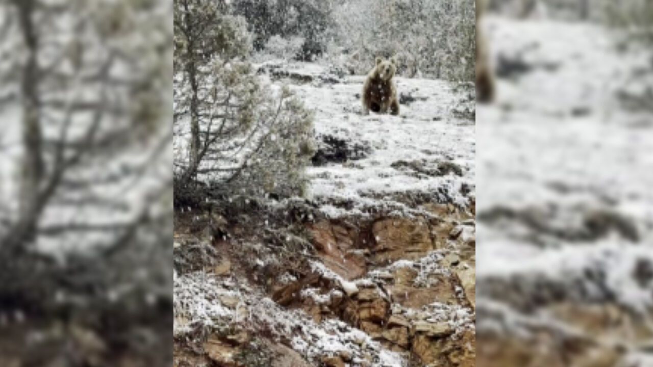 Görüntülerde, karlı arazide ağaçlık bölgeden aşağı inen boz ayının bir süre yol kenarında durması ve etrafına bakınması yer aldı.