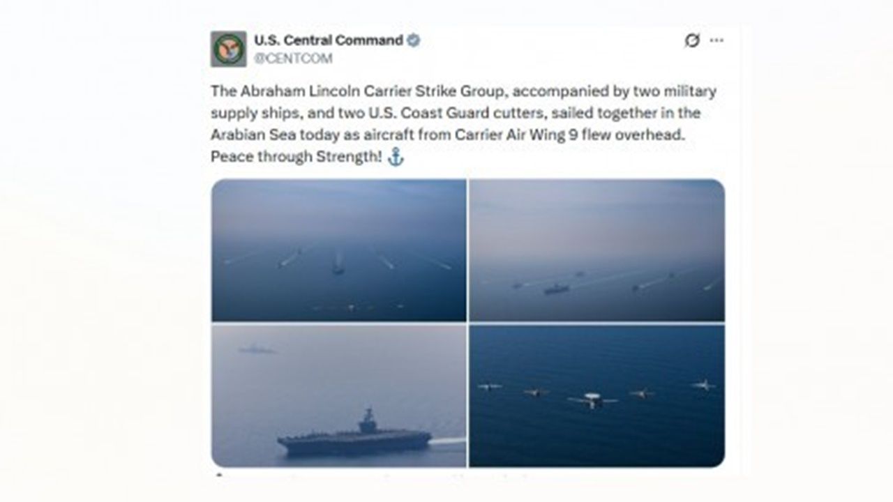 Amerika Birleşik Devletleri Merkez Komutanlığı (CENTCOM), X hesabında yaptığı paylaşımla İran'a saldırı göndermesi yaptı. Paylaşımda, Arap (Umman) Denizi üzerindeki savaş gemileri ve savaş uçaklarının bulunduğu görseller paylaşılarak, "Abraham Lincoln Uçak Gemisi Taarruz Grubu, iki askeri ikmal gemisi ve iki ABD Sahil Güvenlik gemisi eşliğinde bugün Arap Denizi'nde seyrederken, 9. Uçak Gemisi Hava Kanadı'na ait uçaklar da üzerlerinden uçtu. Güçle Barış!" denildi.