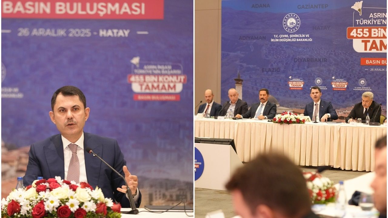 Çevre, Şehircilik ve İklim Değişikliği Bakanı Murat Kurum, 27 Aralık Cumartesi günü Cumhurbaşkanı Recep Tayyip Erdoğan'ın katılımıyla gerçekleştirilecek 455 bininci afet konutunun teslim töreni öncesi Hatay'da medya temsilcileriyle bir araya geldi.