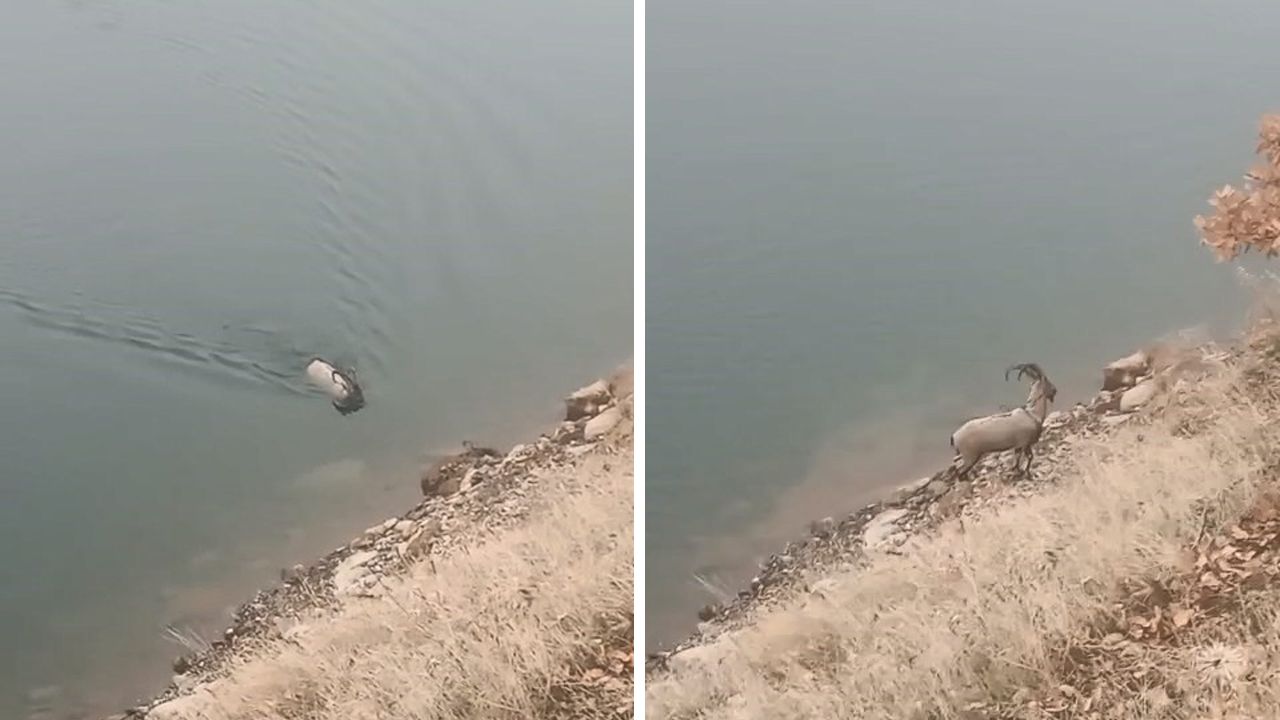 Elazığ'ın Karakoçan ilçesinde dik yamaçlara tırmanma ve tutunma özellikleri ile bilinen koruma altındaki dağ keçisi, bu sefer Özlüce Baraj Gölünde yüzerken görüldü. Yoldan geçen Oktay Ay tarafından kaydedilen görüntüde, dağ keçisinin baraj suyundan çıktıktan sonra yeniden ormanlık alana geçtiği bir süre sonra ise gözden kaybolduğu görüldü.