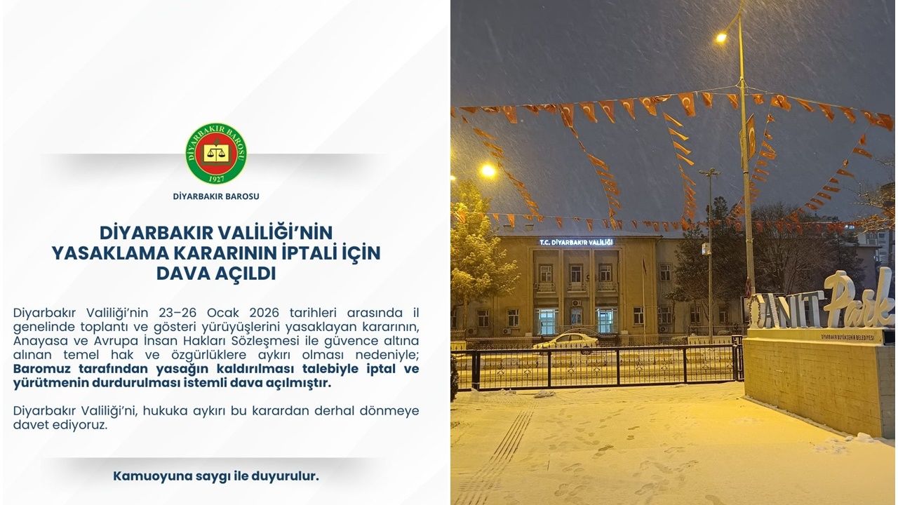 Diyarbakır Barosu’nun konuya ilişkin paylaşımında şu ifadelere yer verildi: “Diyarbakır Valiliği'nin 23-26 Ocak 2026 tarihleri arasında il genelinde toplantı ve gösteri yürüyüşlerini yasaklayan kararının, Anayasa ve Avrupa İnsan Hakları Sözleşmesi ile güvence altına alınan temel hak ve özgürlüklere aykırı olması nedeniyle; Baromuz tarafından yasağın kaldırılması talebiyle iptal ve yürütmenin durdurulması istemli dava açılmıştır. Diyarbakır Valiliği'ni, hukuka aykırı bu karardan derhal dönmeye davet ediyoruz.”