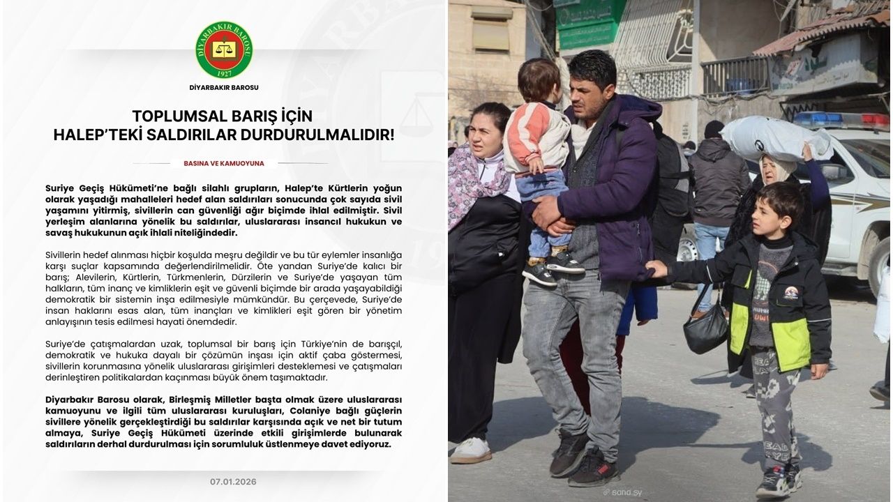 Suriye Geçiş Hükümeti’ne bağlı silahlı grupların, Halep’te Kürtlerin yoğun olarak yaşadığı mahallelere dönük saldırılarına ilişkin açıklama yapan Diyarbakır Barosu: "Suriye’de çatışmalardan uzak, toplumsal bir barış için Türkiye’nin de barışçıl, demokratik ve hukuka dayalı bir çözümün inşası için aktif çaba göstermesi, sivillerin korunmasına yönelik uluslararası girişimleri desteklemesi ve çatışmaları derinleştiren politikalardan kaçınması büyük önem taşımaktadır" ifadelerine yer verdi.