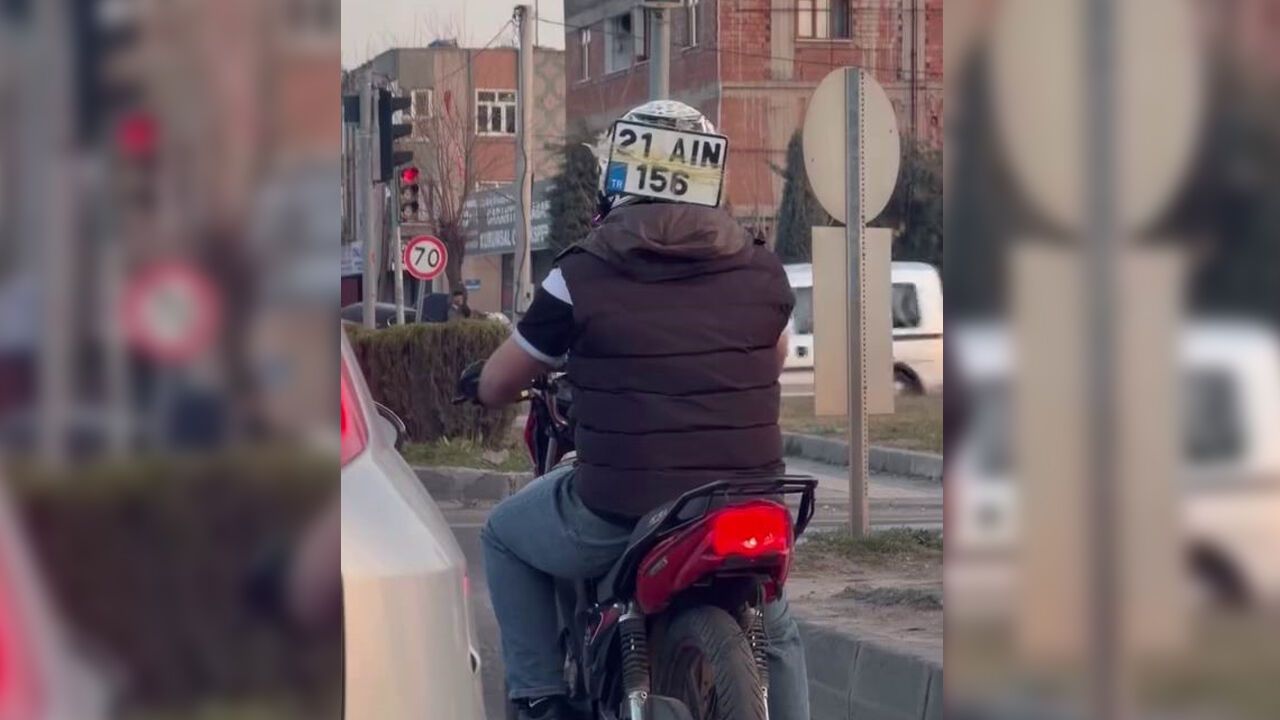 İsmi öğrenilemeyen sürücü, düşen plakasını kaskına bantlayarak trafikte seyretmeye devam etti. İlginç anlar cep telefonu kamerasına yansıdı.
