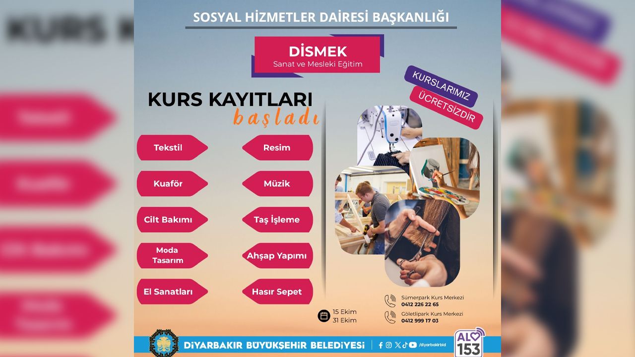 Diyarbakır Büyükşehir Belediyesi Sosyal Hizmetler Dairesi Başkanlığına bağlı Hayat Boyu Öğrenme Şube Müdürlüğü bünyesinde faaliyet yürüten Diyarbakır Büyükşehir Belediyesi Sanat ve Mesleki Eğitim Kursları (DİSMEK), sanat ve mesleki alanda kendini geliştirmek isteyen 16 yaş ve üzeri yurttaşlara yönelik ücretsiz kurs programı başlatıyor.