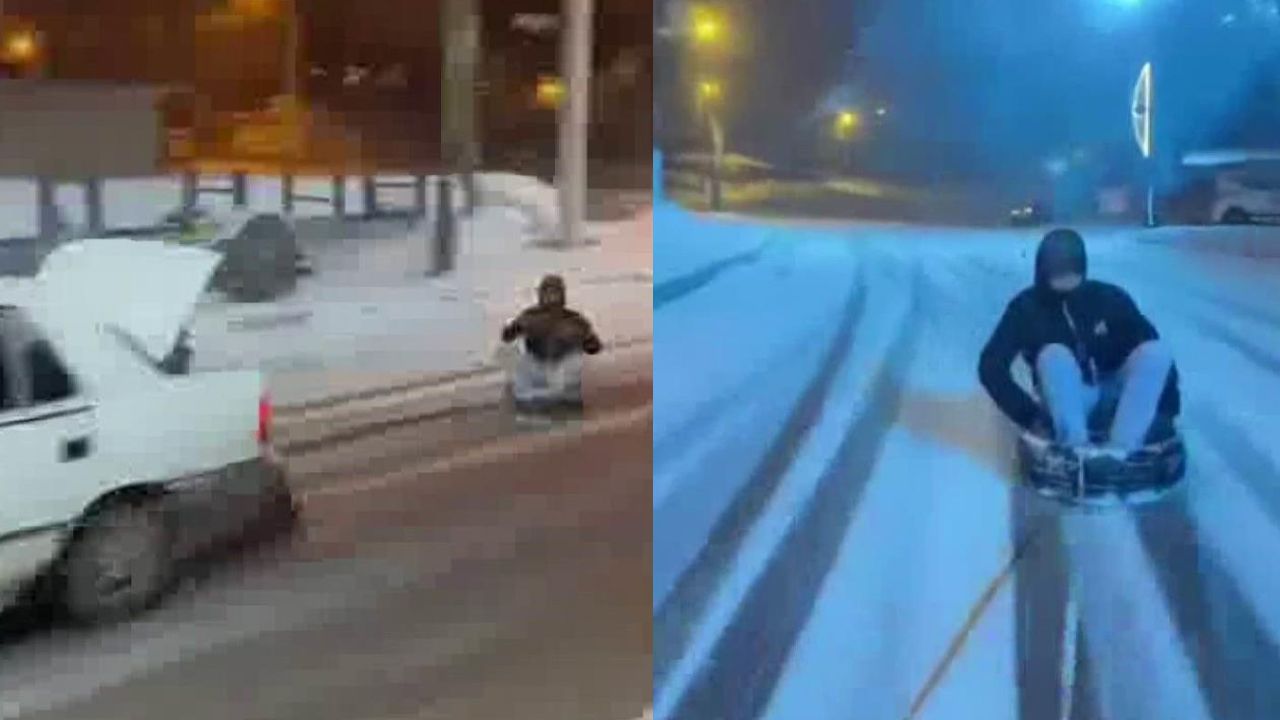 Son dönemlerin en çetin kış aylarının yaşandığı Diyarbakır'da renkli görüntüler de ortaya çıkıyor. Dicle ilçesinde kar üstüne kaymak isteyen bir kişi, otomobilin arkasına araç lastiği bağlayıp oturdu. Aracın bagaj kısmına da arkadaşını oturtan genç, karda kaydığı anları kayıt altına aldırdı. Genç, lastik üzerinde kaydığı sırada sokaktan geçerken arkadaşlarının kartopu saldırısına uğradı. O anlar renkli görüntüler oluşturdu.