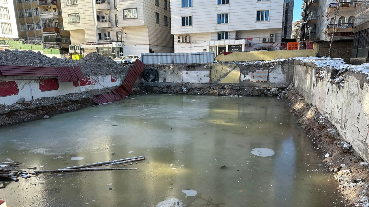 Yılbaşından itibaren Diyarbakır’da etkili olan kar yağışı ve yağmur sularının biriktiği Karaşin Apartmanı temel kazısı, dün akşamki soğuklar nedeniyle donarak buz tuttuğu görüldü.