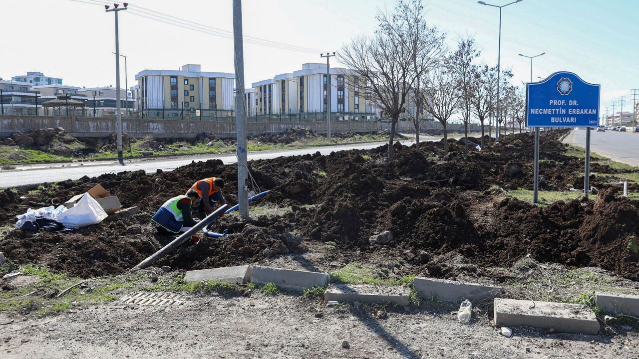 Prof. Dr. Necmettin Erbakan Bulvarı’nın Diclekent Bulvarı ile Şanlıurfa yolu arasındaki bölümünde çalışmalarını sürdüren ekipler, daha önce ağaçlandırılmış refüjlerin sulama hatlarını da elden geçirerek yeniledi.