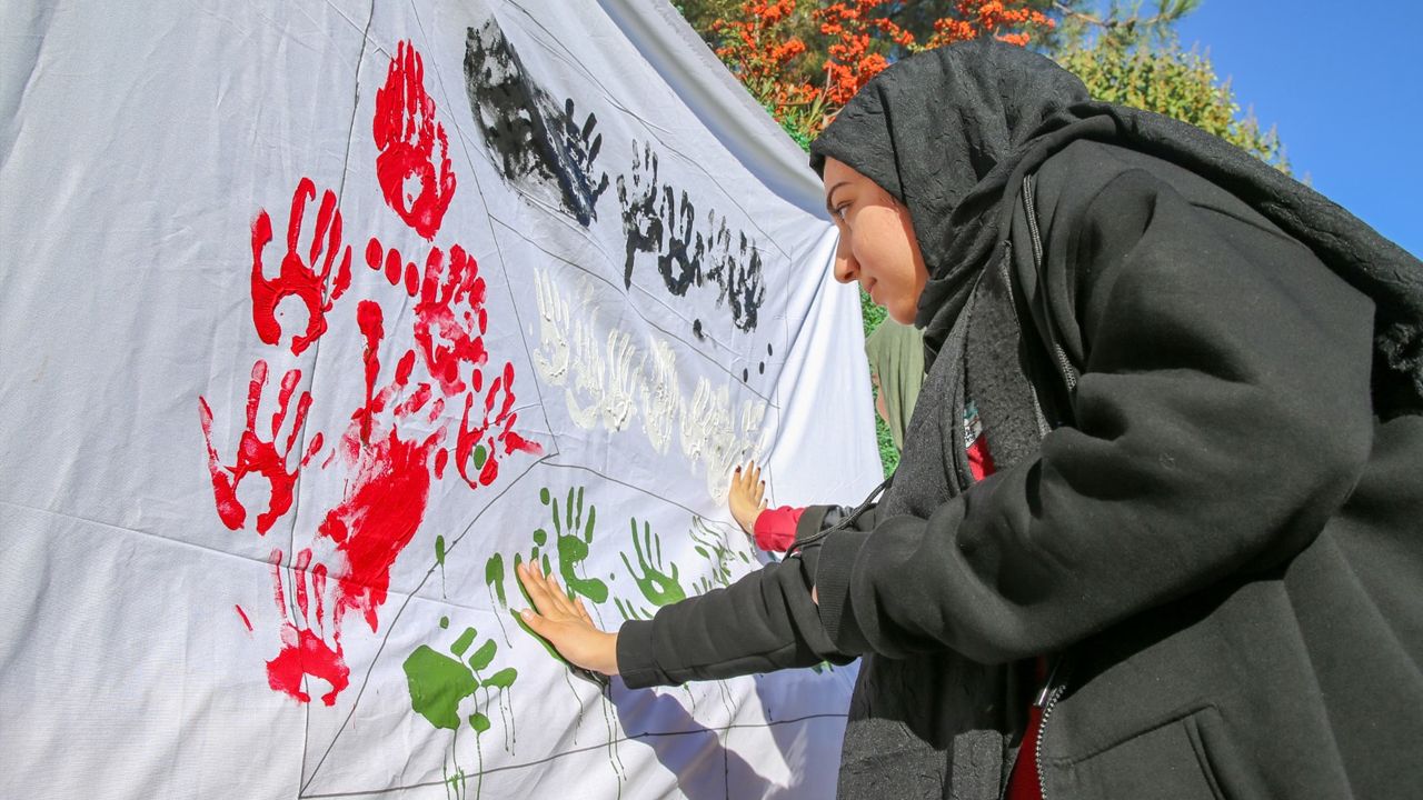 Eğil Belediyesi tarafından İsrail'in saldırılarına tepki göstermek ve yaşanan zulme dikkati çekmek amacıyla "Filistin için sen de iz bırak" etkinliği yapıldı. Etkinliğe katılan öğrenciler, kırmızı, siyah ve yeşile boyadıkları parmaklarını ve ellerini kumaştan oluşturulan panoya basarak Filistin bayrağını simgeleyen bir çalışma ortaya çıkardı.