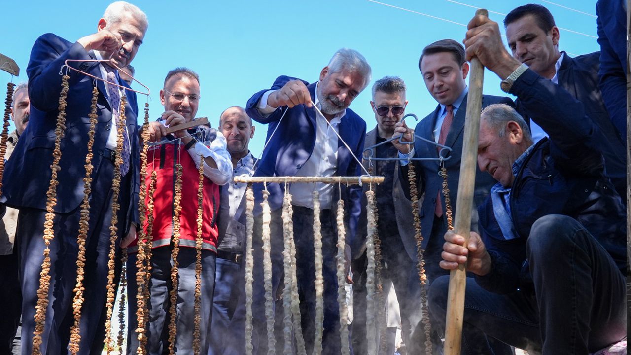 Konuşmaların ardından protokoldekiler kazan başına geçip, ipe takılı cevizleri kaynayan bulamaca batırdı.
