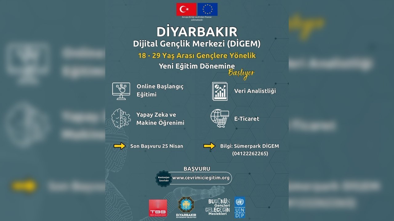 Diyarbakır Büyükşehir Belediyesi, Avrupa Birliği finansmanı, Birleşmiş Milletler Kalkınma Programı (UNDP) ve Türkiye Belediyeler Birliği (TBB) iş birliğiyle hayata geçirilen “Bugünün Gençleri Geleceğin Meslekleri” projesiyle gençleri dijital çağın ihtiyaç duyduğu alanlarla buluşturuyor. Dijital Gençlik Merkezi’nde (DİGEM) yürütülecek program kapsamında 18-29 yaş arası çalışmayan gençler; e-ticaret, veri analistliği, yapay zekâ gibi stratejik alanlarda eğitim alarak hem meslek edinecek hem de iş hayatına daha güçlü ve donanımlı bir başlangıç yapacak.