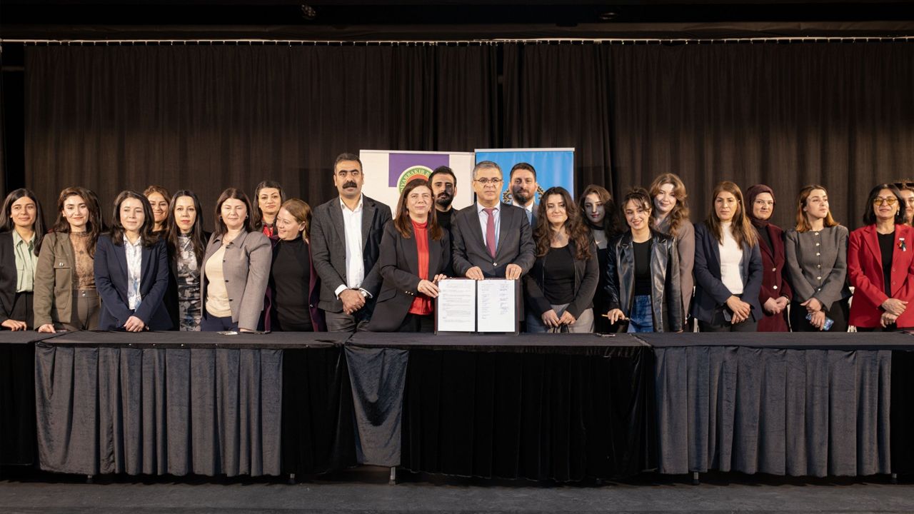 Diyarbakır Büyükşehir Belediyesi ve kentteki DEM Partili 13 ilçe belediyesi ile Diyarbakır Barosu arasında, kadınların adalete erişiminin kolaylaştırılması, hak temelli destek mekanizmalarının güçlendirilmesi ve toplumsal cinsiyet eşitliğinin yerel yönetimler düzeyinde kurumsal olarak desteklenmesi amacıyla iş birliği protokolü imzalandı. Protokolün imza töreni Ali Emiri Konferans Salonu’nda yapıldı. Törene Büyükşehir Belediyesi Eşbaşkanları Serra Bucak ve Doğan Hatun, Diyarbakır Barosu Başkanı Abdülkadir Güleç, ilçe belediye eşbaşkanları, DBB Genel Sekreter Yardımcısı Zerin Türk, Kadın Politikaları Dairesi Başkanı Özden Gürbüz Sümer, sivil toplum örgütü temsilcileri, Diyarbakır Barosu üyeleri ile baronun Kadın Hakları Merkezi üyeleri ve ilçe belediyelerinin kadın müdürlüklerinde görev yapan kadınlar katıldı.