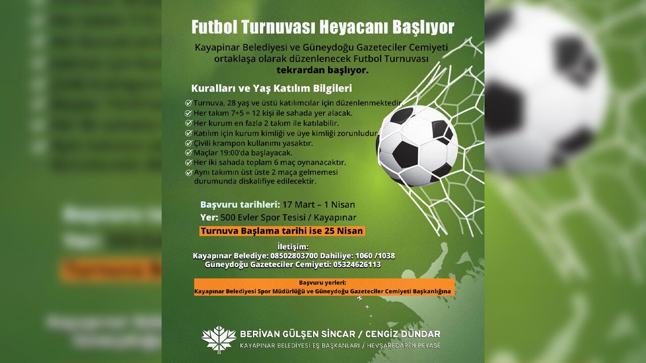Kayapınar Belediyesi Spor Müdürlüğü ve Güneydoğu Gazeteciler Cemiyeti’nin daha önce geleneksel hale gelen ve uzun süre yapılmayan, geçen yıl ilki yapılan ‘Kurumlar Arası Halı Saha Futbol Turnuvası’ ikincisi başlıyor. Turnuva katılmak isteyen kurumlar 1 Nisan’a kadar başvuru yapacakları turnuva 25 Nisan tarihinde start alacak.