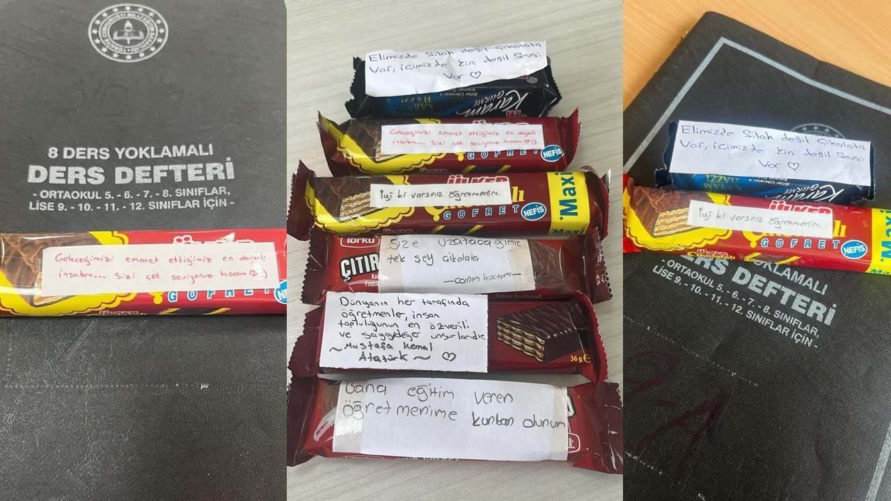 Öğrenciler kendi aralarında topladıkları harçlıklarla çeşitli hediyeler alıp üzerlerine yazdıkları, "Öğretmenlere silah değil çikolata uzatılır", "Bana eğitim veren öğretmenime kurban olurum", "Dünyanın her tarafında öğretmenler, insan topluluğunun en özverili ve saygıdeğer unsurlarıdırlar", "İyi ki varsınız öğretmenim", "Geleceğimizi emanet ettiğimiz en değerli insanlara, sizi çok seviyoruz hocam", "Elimizde silah değil çikolata var, içimizde kin değil sevgi var" notlarını yapıştırdı. Öğrenciler daha sonra sınıfları gezerek öğretmenlerine üzerinde notlarının bulunduğu çikolataları öğretmenlere verdi.