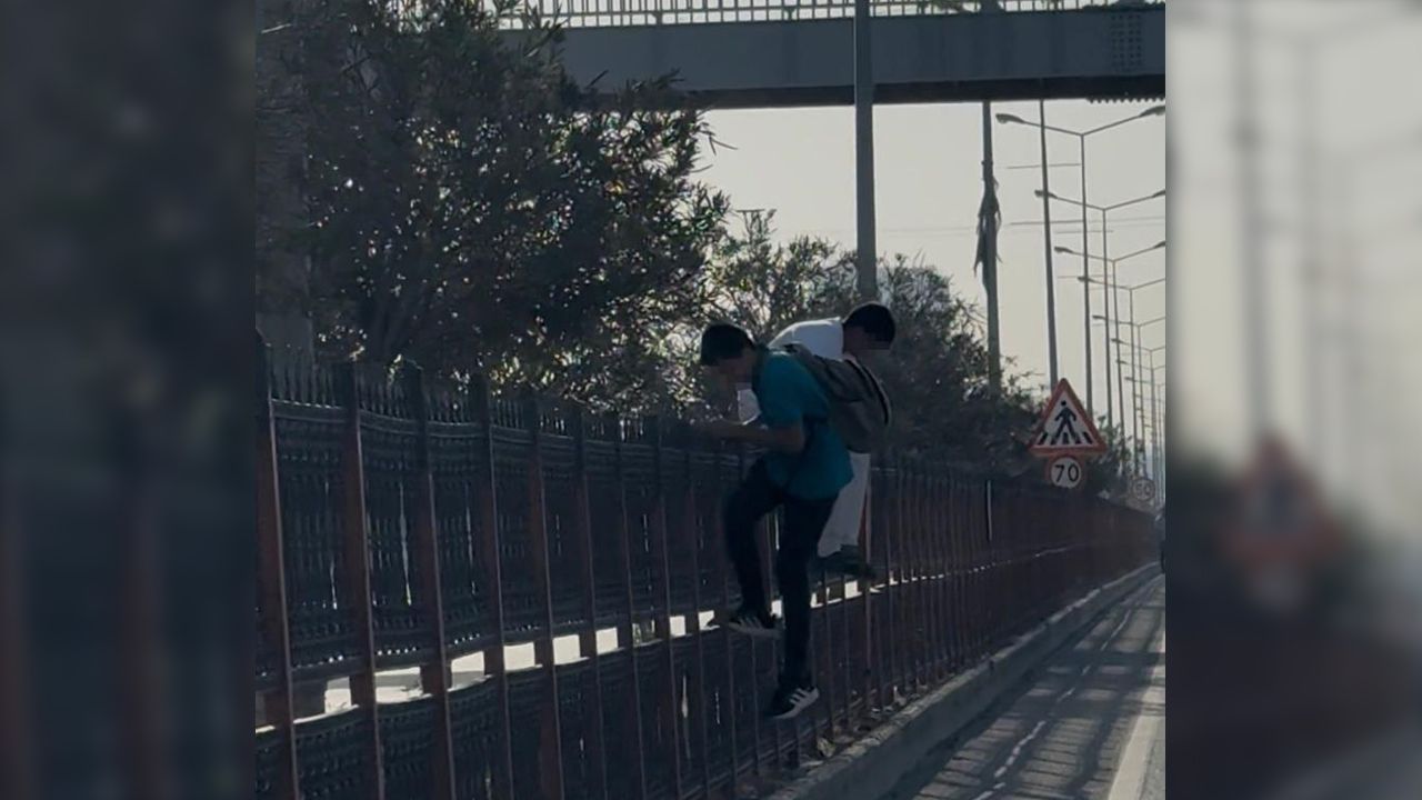 Bölgede bulunan öğrenciler, üst geçide sadece birkaç metre mesafede olmalarına rağmen tellerden atlayarak yolun karşısına geçmeye çalışıyor.
