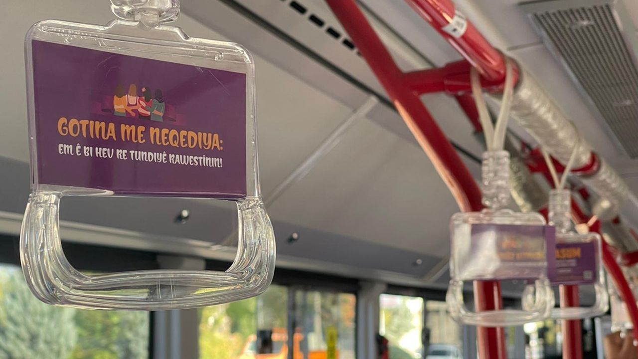 Diyarbakır Büyükşehir Belediyesi, kadına yönelik şiddetle mücadeleye dikkat çekmek amacıyla yeni bir farkındalık projesine imza attı. Şehrin yeni belediye otobüslerinde, tutacaklara yerleştirilen mesajlar hem Türkçe hem Kürtçe olarak vatandaşlara ulaşıyor.