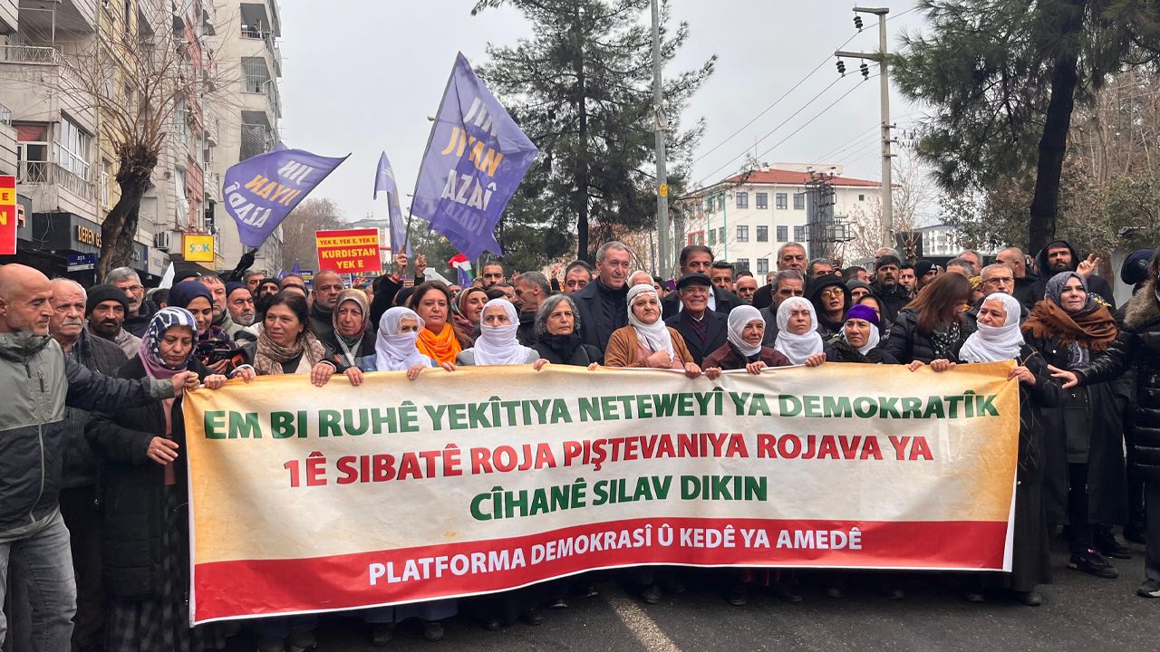 Amed Demokratik Platformlar Kurumu tarafından Diyarbakır’da düzenlenen “1 Şubat Dünya Rojava ile Dayanışma Günü” kapsamında Koşuyolu Parkı’ndaki İnsan Hakları Anıtı önünde toplanan büyük bir kalabalık, Ofis Semti’nde bulunan AZC Plaza önüne doğru yürüyüşe geçti.