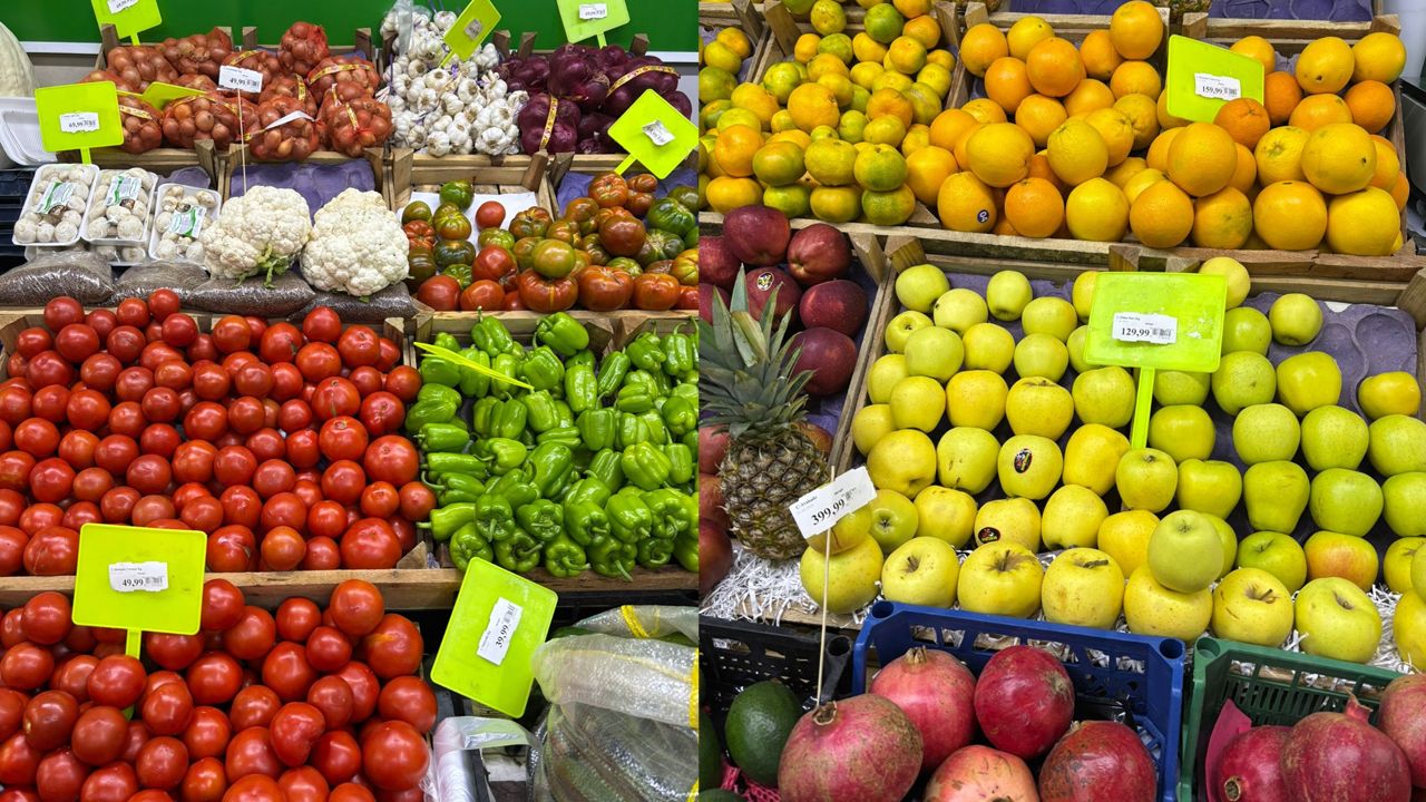 Kent merkezindeki marketlerde Muz’un kilosu 149.99, kırmızı elma 129.99, yeşil elma 120.99, greyfurt 159.99, mandalina 24.99, avokado 399.99, armut 149.99, greyfurt 199.99, ayva 149.99, domates 49.99, mantar 69.99, kuru soğan 69.99, sarımsak 349.99, mor soğan 69.99, organik domates 69.99, kırmızı acı biber 159.99, sera domatesi 114.99, sivri biber 79.99, isot 129.99, salkım domatesi 99. 99, çarliston biber 89.99, limon 64.99 ve kabak 69,99 liradan satılıyor.