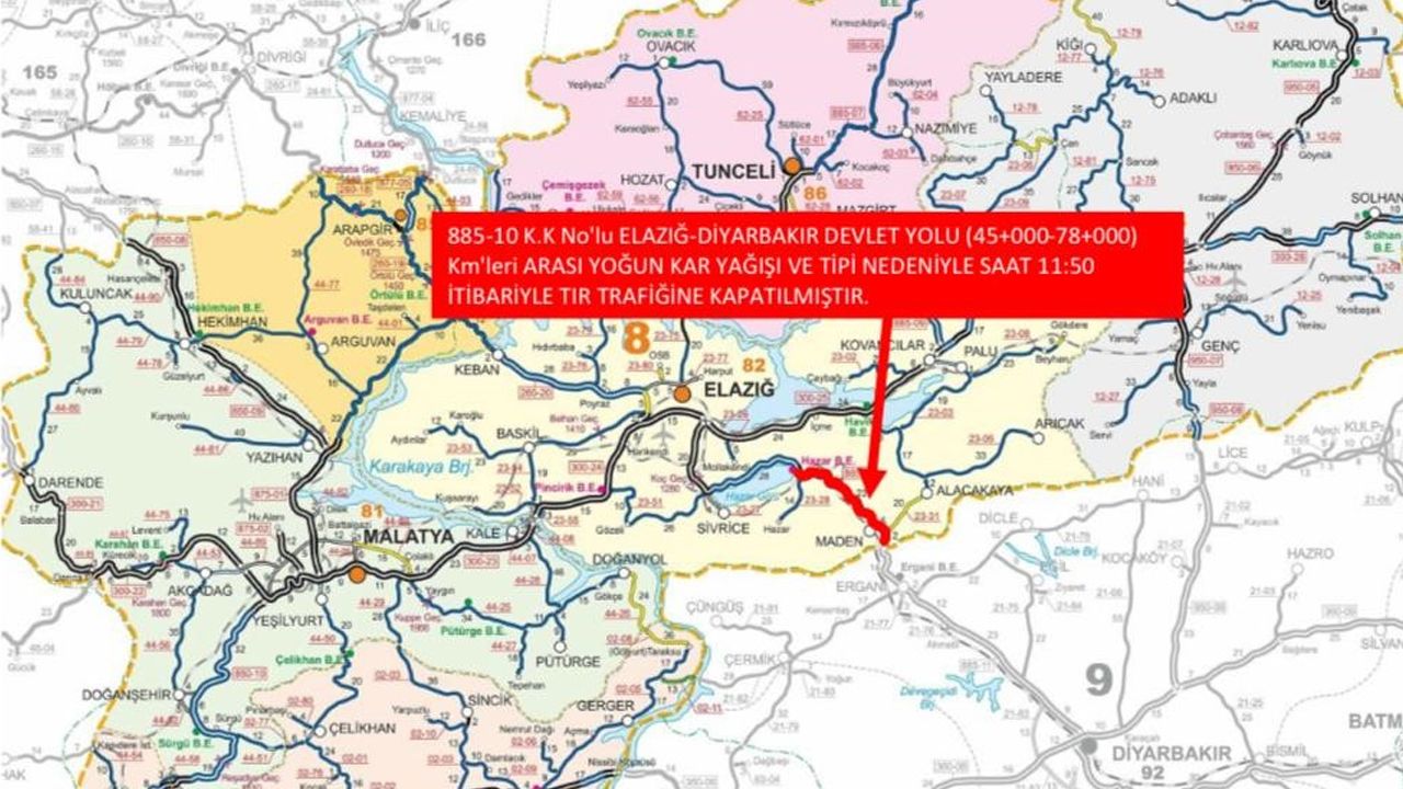 Meteorolojinin uyarı yaptığı Elazığ’da kar yağışı etkisini sürdürüyor. Bu çerçevede karayolları Genel Müdürlüğü tarafından yapılan açıklamada, Elazığ-Diyarbakır Yolu’nun 45-78. kilometreleri arasının yoğun kar yağışı ve tipi nedeniyle ağır taşıt trafiğine geçici olarak kapatıldığı aktarıldı.
