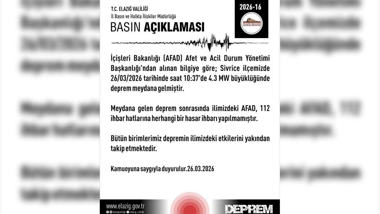 Yapılan açıklamada, “İçişleri Bakanlığı (AFAD) Afet ve Acil Durum Yönetimi Başkanlığı’ndan alınan bilgiye göre; Sivrice ilçemizde 26/03/2026 tarihinde saat 10:37’de 4.3 MW büyüklüğünde deprem meydana gelmiştir. Meydana gelen deprem sonrasında ilimizdeki AFAD, 112 ihbar hatlarına herhangi bir hasar ihbarı yapılmamıştır. Bütün birimlerimiz depremin ilimizdeki etkilerini yakından takip etmektedir. Kamuoyuna saygıyla duyurulur” denildi.