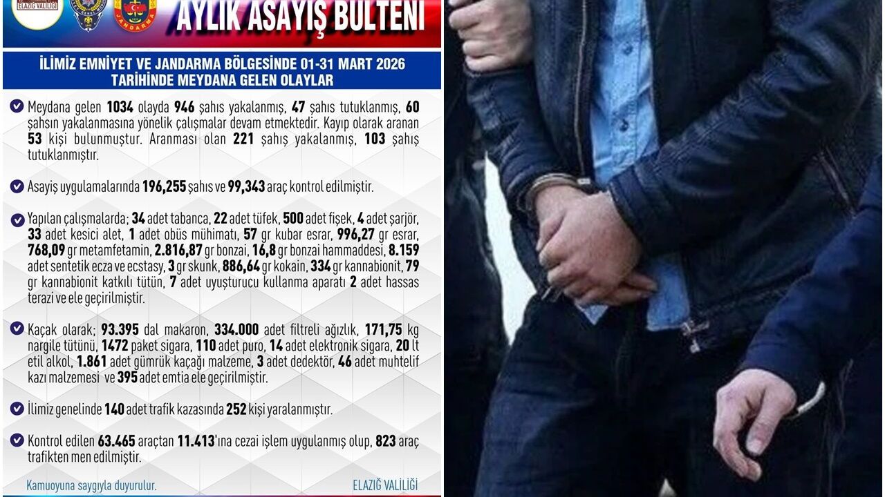 Elazığ Valiliği, 01-31 Mart 2026 tarihlerini kapsayan asayiş bültenini yayımladı. Bültende yer alan bilgilere göre, kent genelinde meydana gelen bin 34 olayda 946 şahıs yakalandı, 47 kişi de tutuklandı. Yine aranması olan 221 şahıs yakalanırken 103’ü tutuklandı. Çalışmalarda 196 bin 255 şahıs ve 99 bin 343 araç denetlendi. Kontrol edilen araçlardan, 11 bin 413’üne cezai işlem uygulanırken 823 araç da trafikten men edildi. Kent genelinde meydana gelen 140 adet trafik kazasında 252 kişi yaralandı.