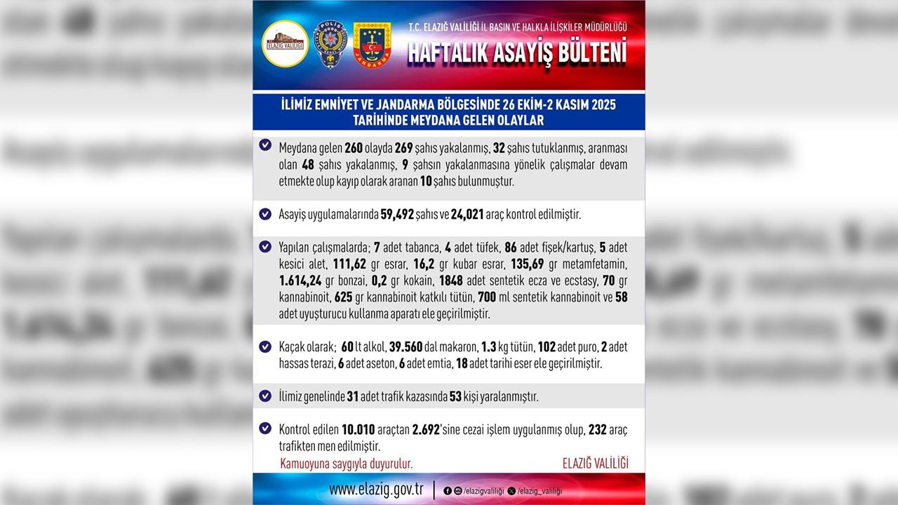 Elazığ Valiliği, 26 Ekim-2 Kasım 2025 tarihleri arasındaki haftalık asayiş verilerini açıkladı. Cumhuriyet Başsavcılığı koordinesinde güvenlik güçleri tarafından yapılan çalışmalarda kentte, 260 olayın meydana geldiği bildirildi. Bu olaylarda 269 şahıs yakalanırken, 32 kişi tutuklandı, aranması olan 48 kişi de gözaltına alındı. Ayrıca 9 şahsın yakalanmasına yönelik çalışmaların sürdüğü, 10 kayıp şahsın ise bulunduğu belirtildi. Asayiş uygulamalarında 59 bin 492 şahıs ve 24 bin 21 araç kontrol edildi. Yapılan operasyonlarda 7 tabanca, 4 tüfek, 86 fişek, çok sayıda kesici alet, 1,6 kilogram bonzai, 135 gram metamfetamin, bin 848 sentetik hap ve 700 mililitre sentetik kannabinoid ele geçirildi.
