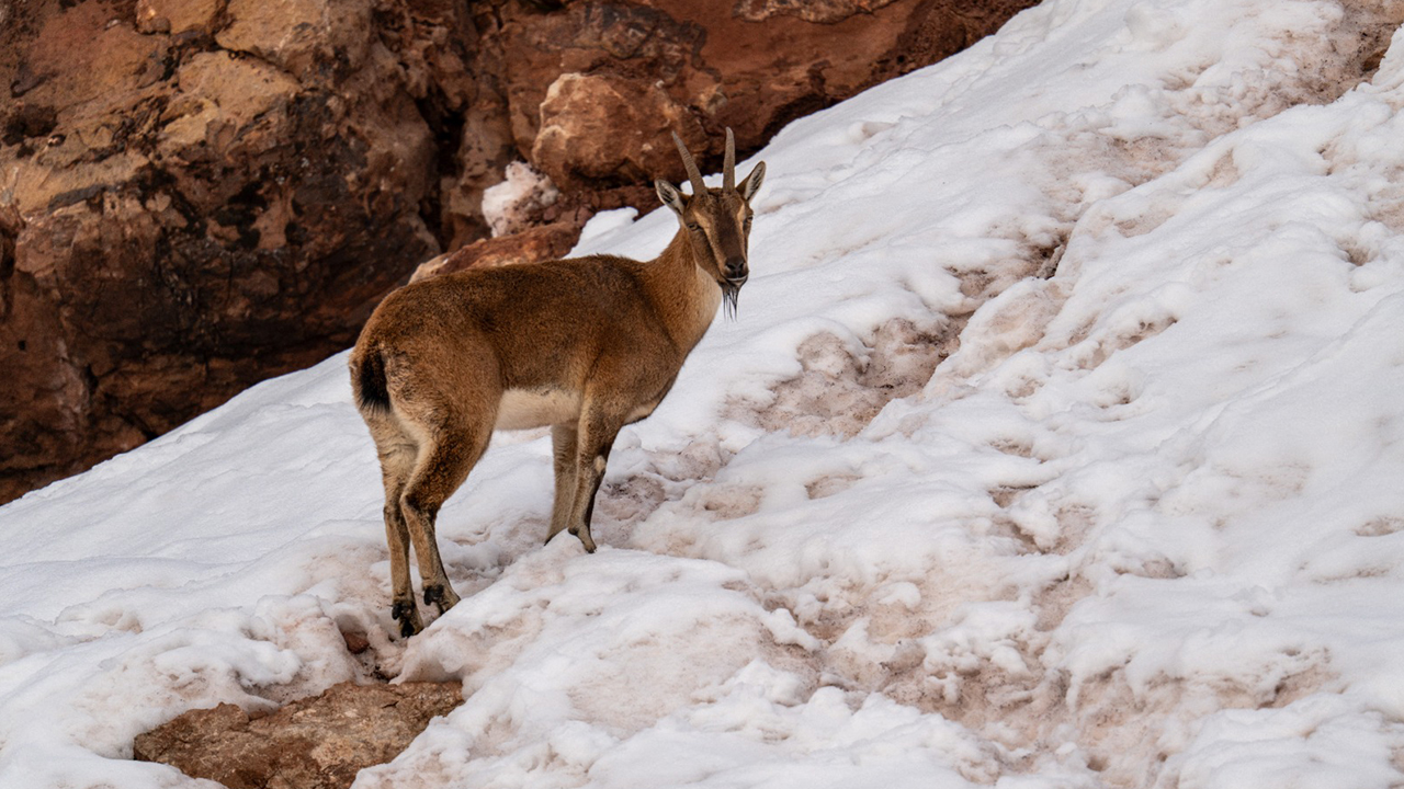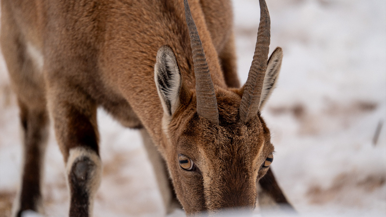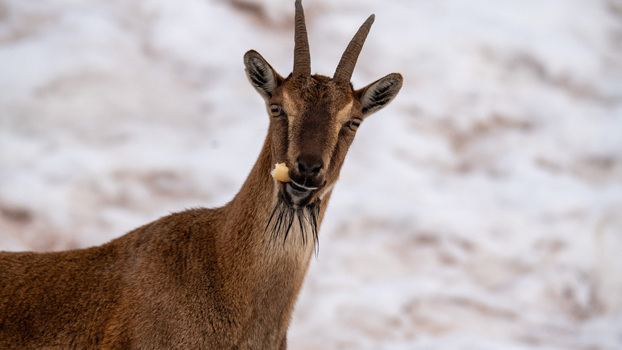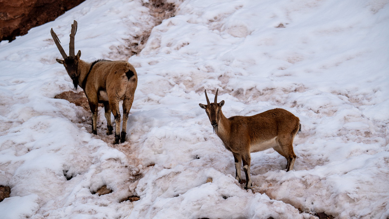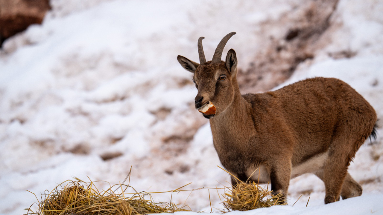 Adıyaman'da köy merkezine inen yaban keçileri, karlı bölgede yiyecek ararken görüntülendi.
