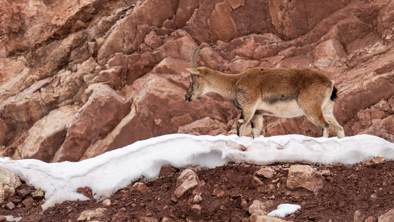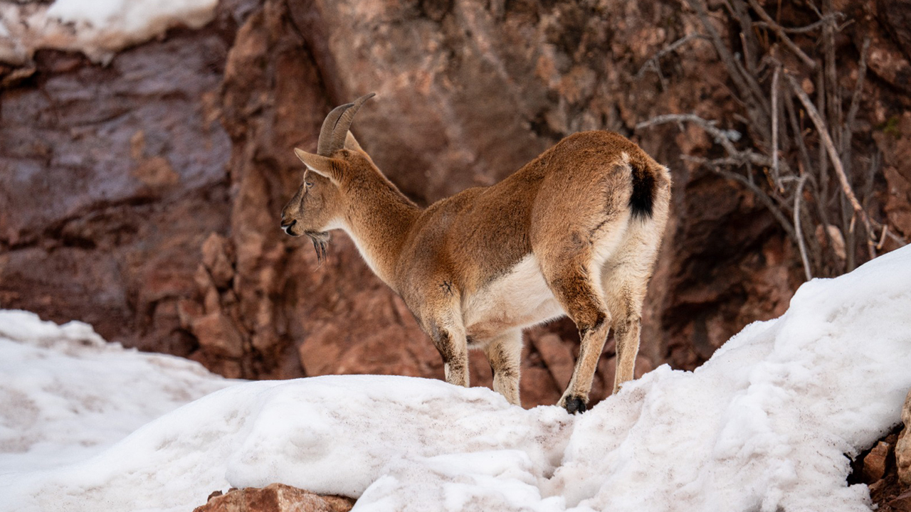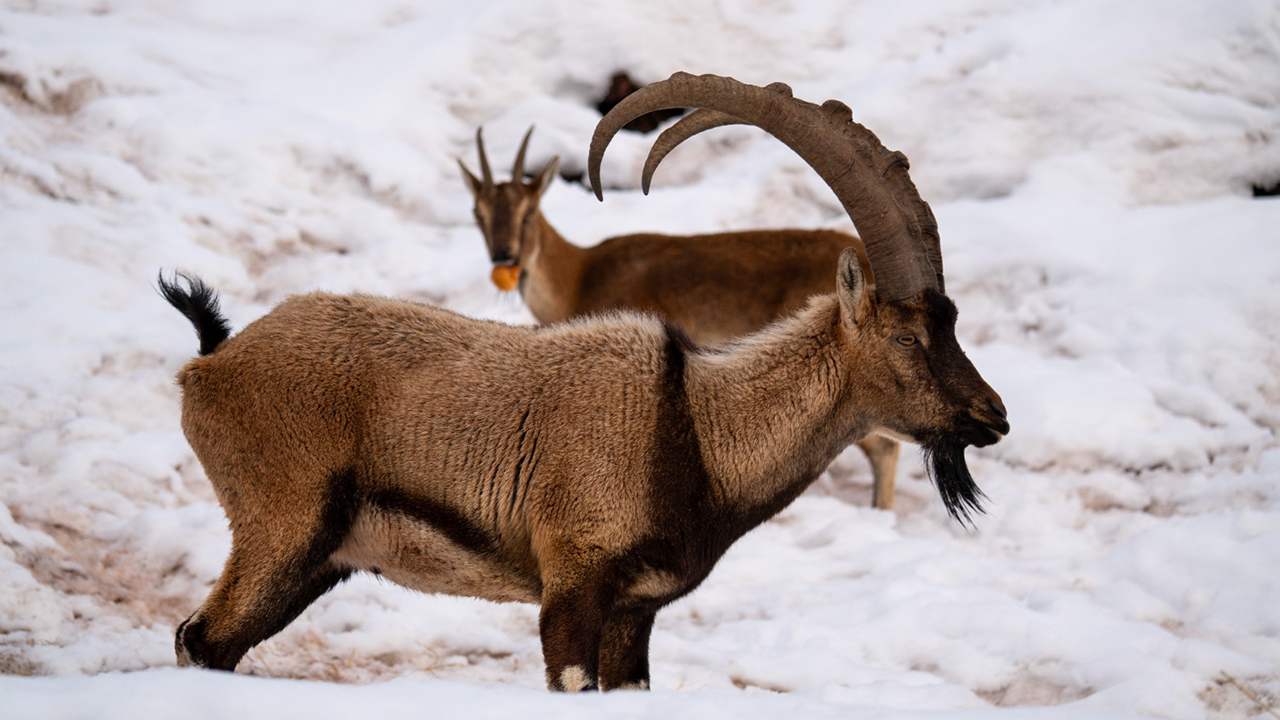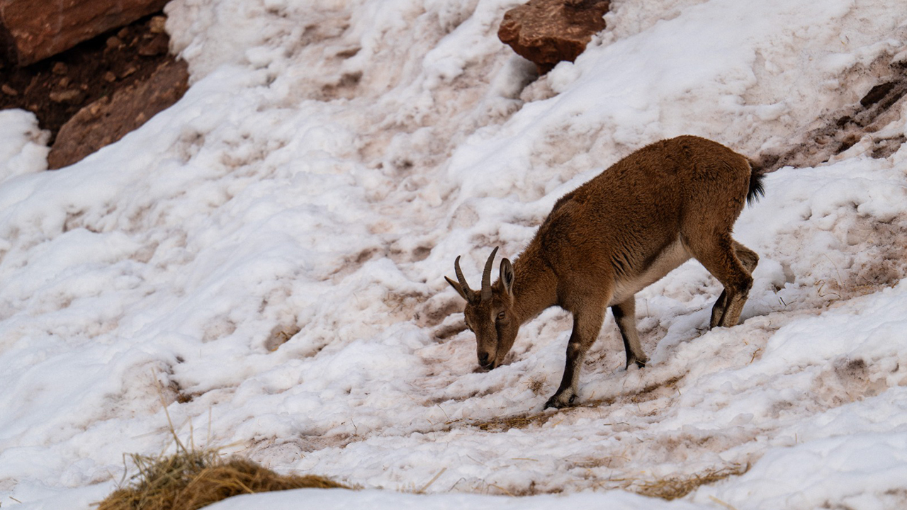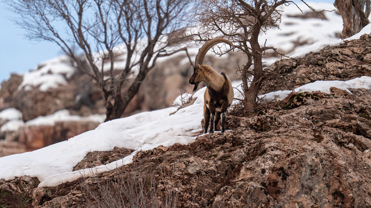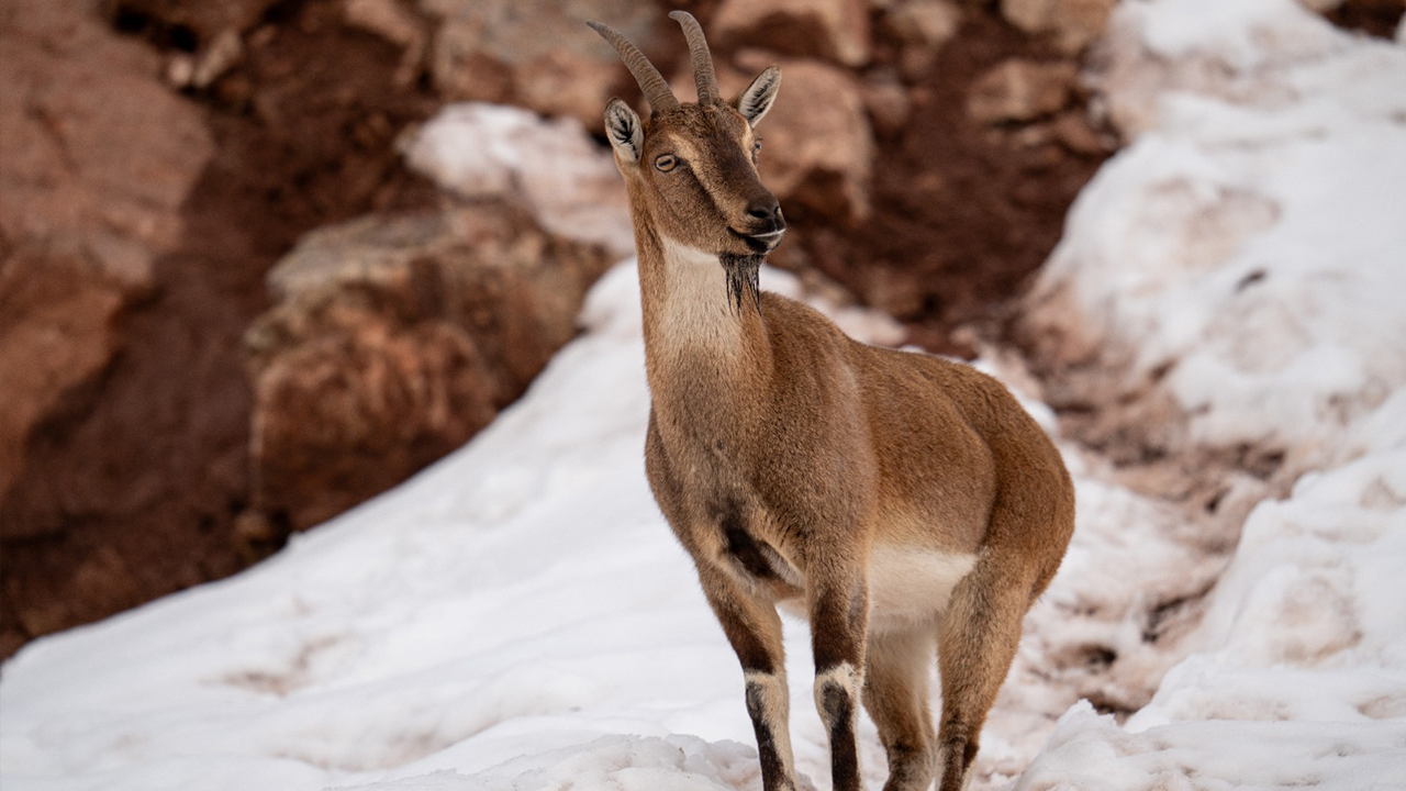 Adıyaman'da köy merkezine inen yaban keçileri, karlı bölgede yiyecek ararken görüntülendi.