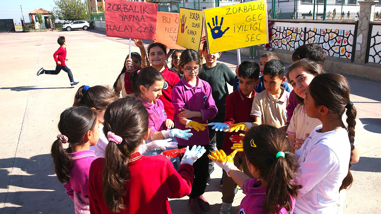 Öğretmen Bağlam, son zamanlarda akran zorbalığının toplumsal bir problem haline geldiğini söyledi. Akran zorbalığının küçük yaşlardaki çocuklarda dahi görüldüğüne işaret eden Bağlam, "Akran zorbalığıyla ilkokulda da çok fazla karşılaşıyoruz. Bu duruma ilişkin farkındalık için 'Zorbalık Yapma, Halay Çek Projesi'ni hayata geçirdik. 'Zorba olma arkadaş ol' temasıyla etkinlikler yaptık. 'Zorbalığa hayır' diyerek okul duvarına imzalarımızı attık. Velilerimiz için de seminerler hazırladık. Öğrencilerimiz için 'Zorbalık yapma arkadaş ol' yazılı bileklik hazırladık. Boyanan bileklikleri okuldaki tüm öğrenciler eş zamanlı olarak bileklerine taktı. Teneffüslerde öğrenciler birbirlerine bilekliklerini gösterdi" dedi.