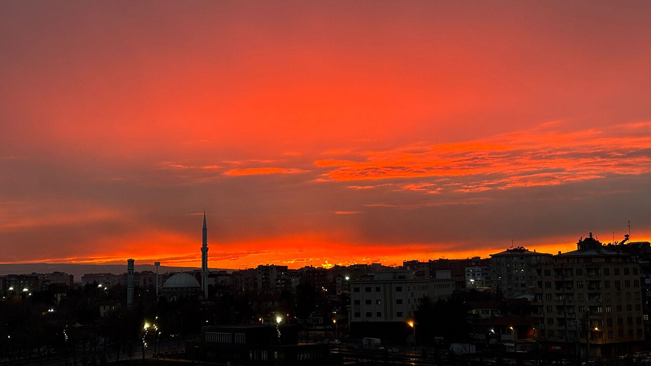 Güneşin batışı sırasında Sümer Camii siluetiyle birleşen kızıl tonlar, gökyüzündeki bulutların üzerinde etkileyici desenler oluşturdu.