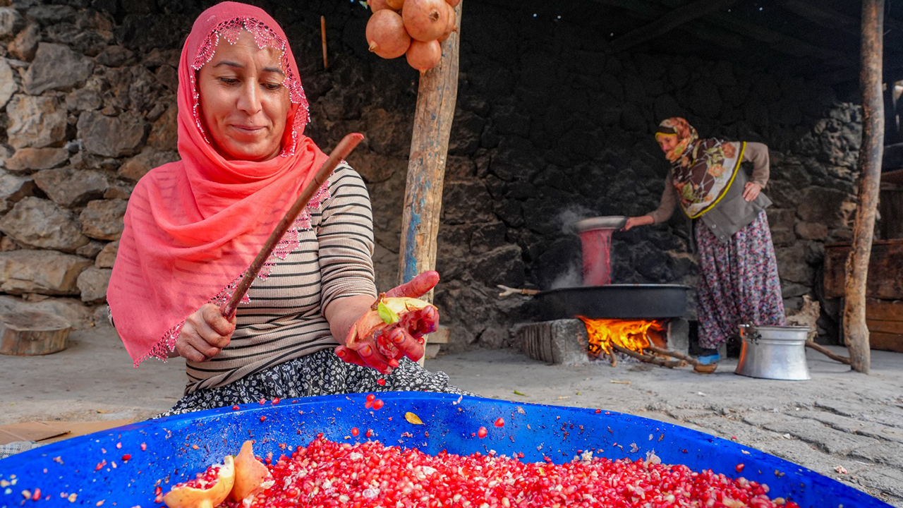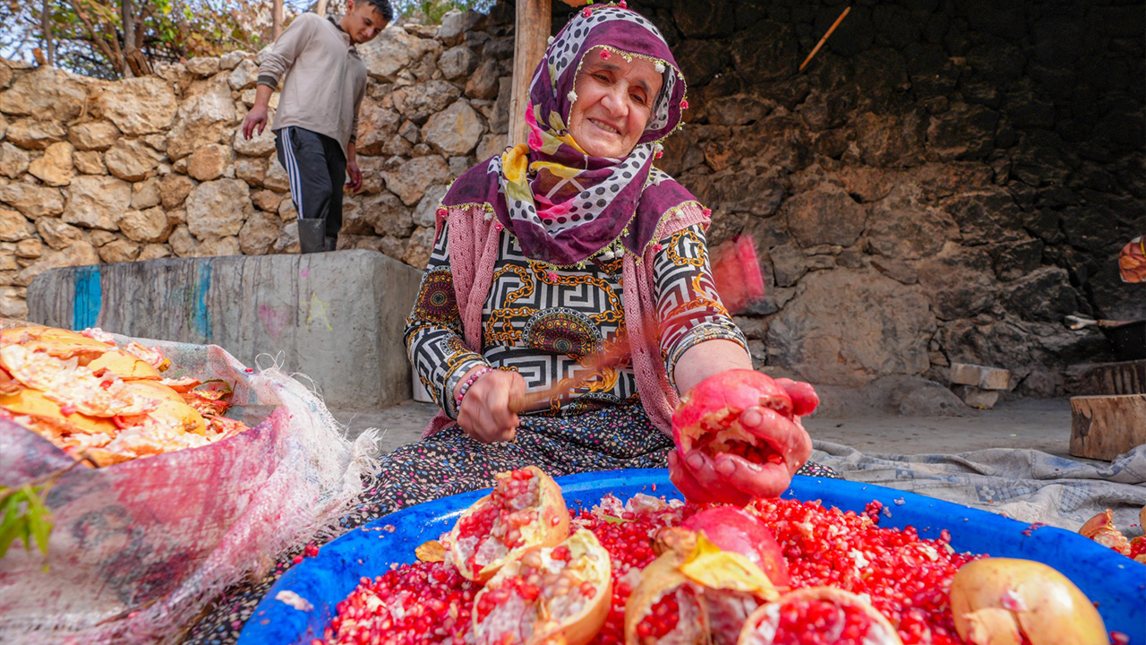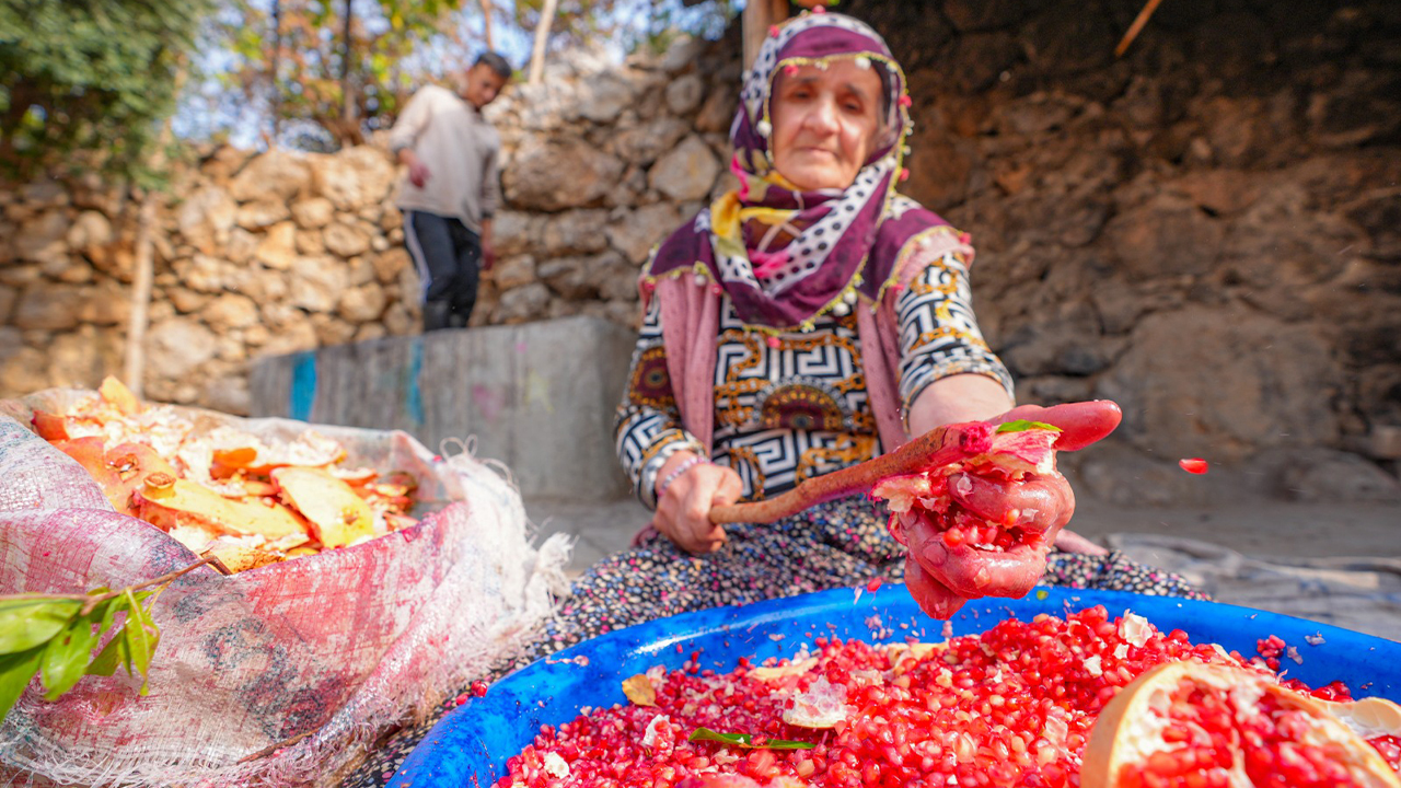 "Olgunlaşan narlar çatlıyor, biz de topluyoruz ve eve getiriyoruz. Tanelerini değnekle döküyoruz. Suyunu çıkarıp kaynatıyoruz.