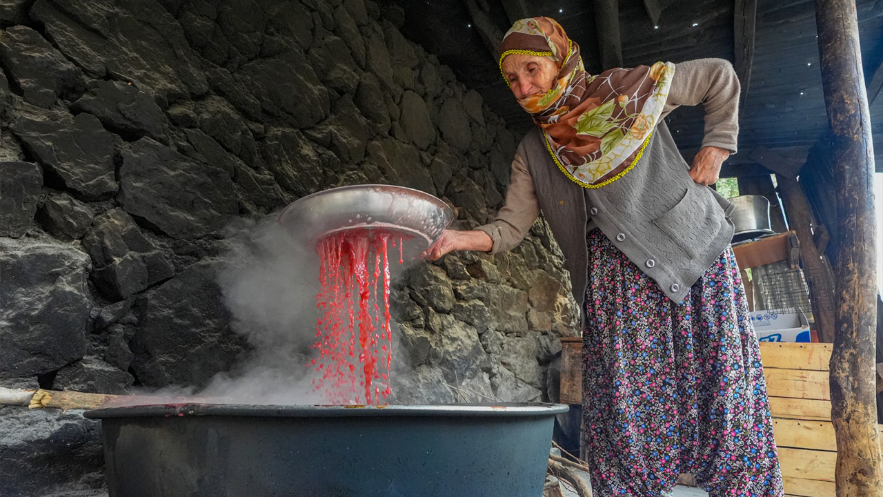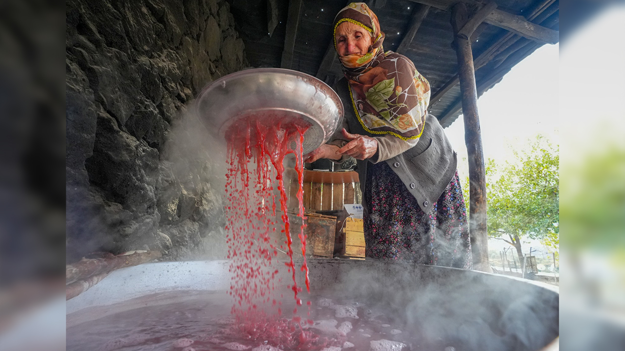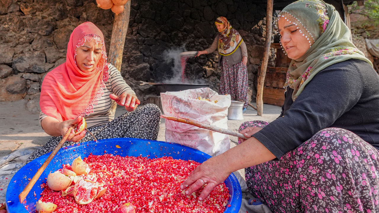 Ardından çuvallara doldurulan nar taneleri ezilerek suyu çıkarılıyor. Kadınlar, elde ettikleri nar suyunu, kurulan kazanlarda odun ateşinde saatlerce kaynatarak nar ekşisine dönüştürüyor.