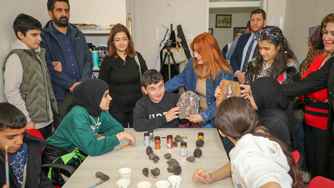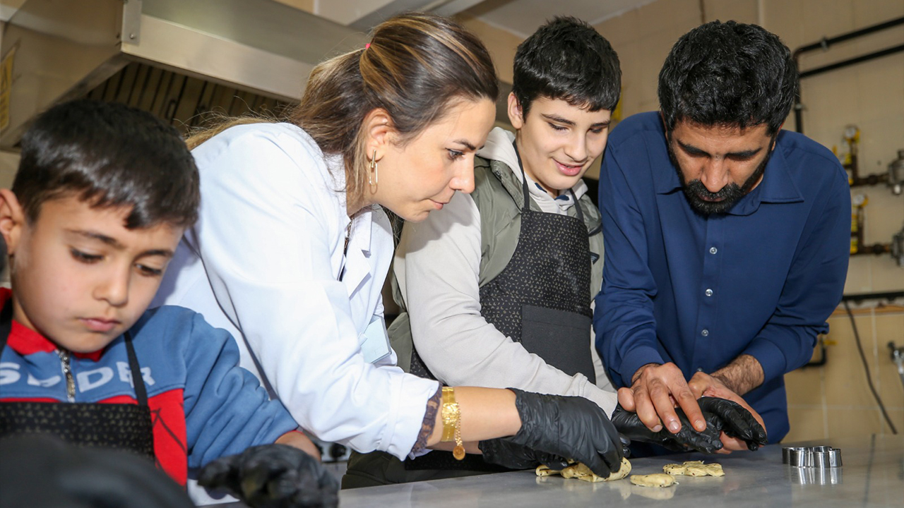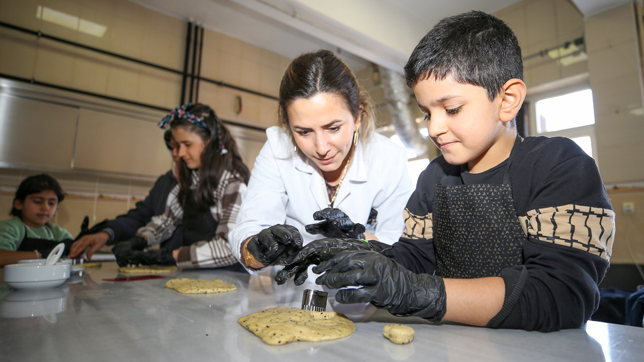 Görme ve işitme engelli çocuklar, atölyeleri tek tek gezerek yapılan çalışmalara, üretilen ürünlere katkı sunuyor. Giyim tasarım atölyesinde hazırlanan hasır çantaların son ilmeğini atan öğrenciler, resim atölyesinde taşlar üzerine işlenen resimlere de son fırçayı vuruyor, yiyecek içecek atölyesinde hamur yoğurarak, Diyarbakır çöreği hazırlıyor.