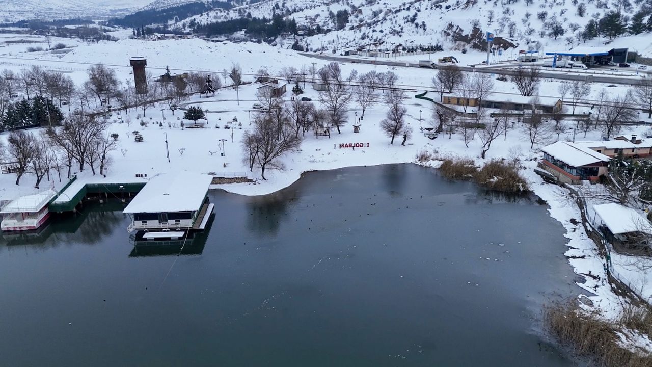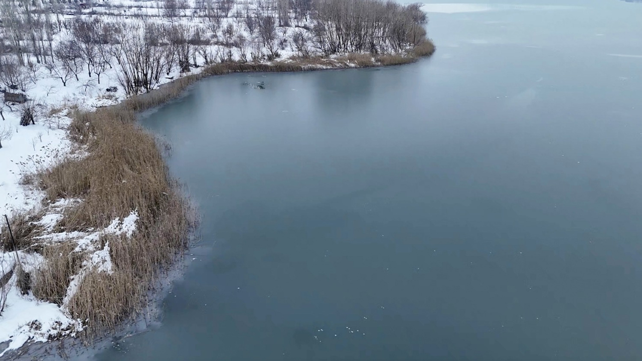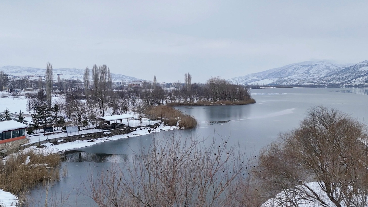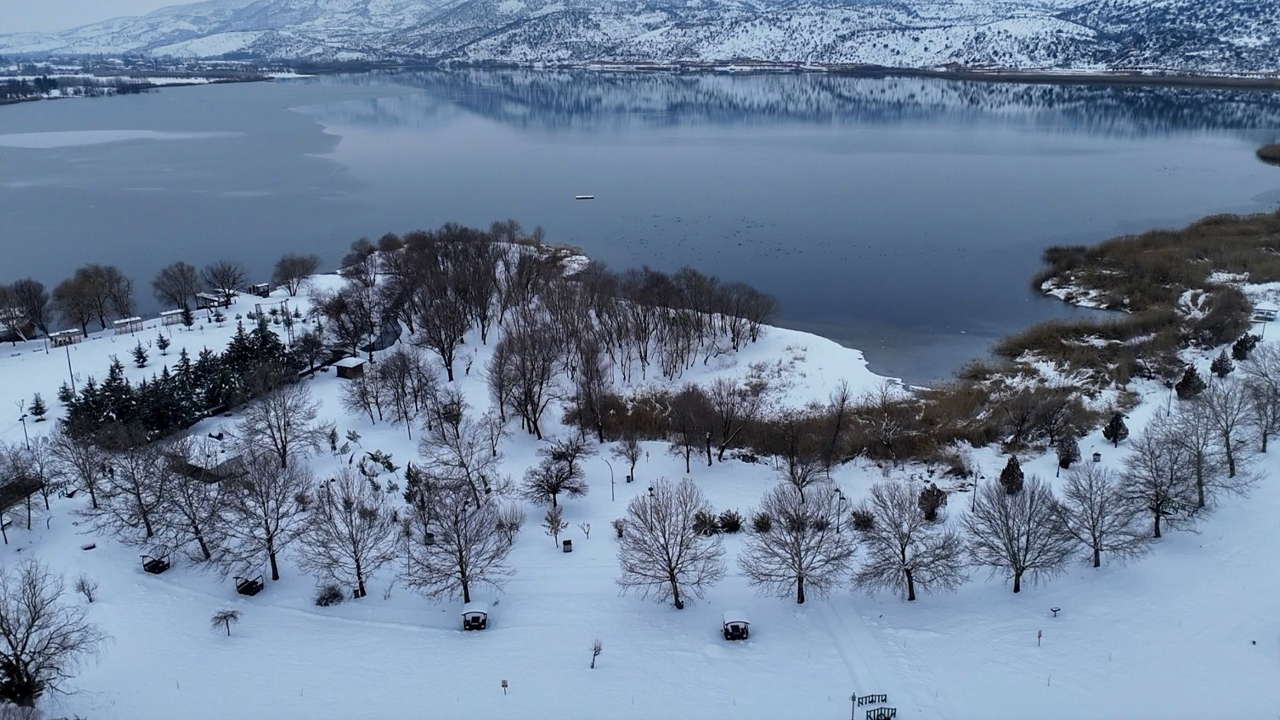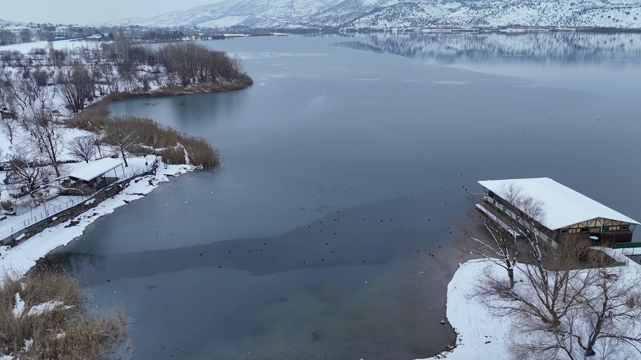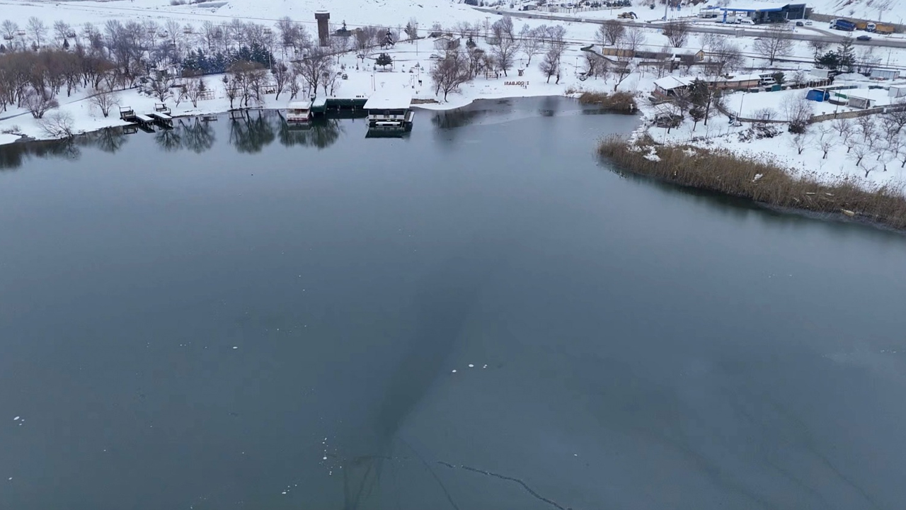 Soğuk havanın etkisiyle göl yüzeyi tamamen donarken, yağan kar bölgeyi beyaza bürüdü.