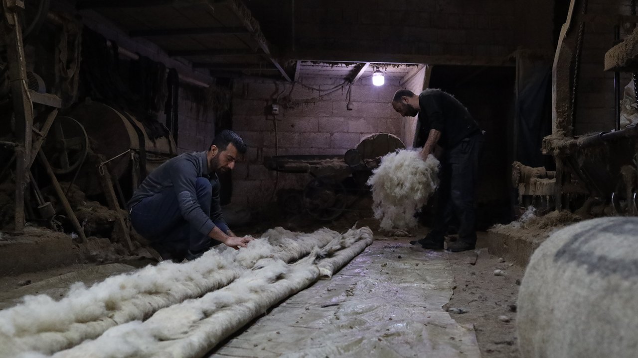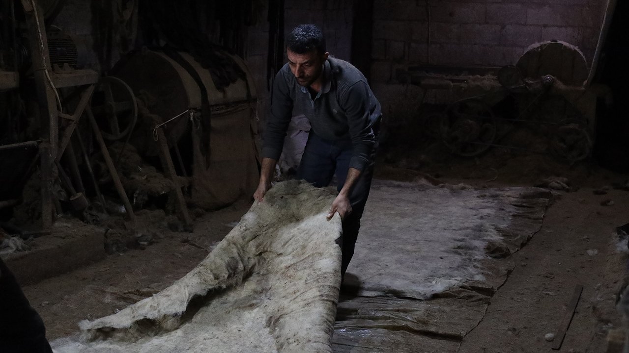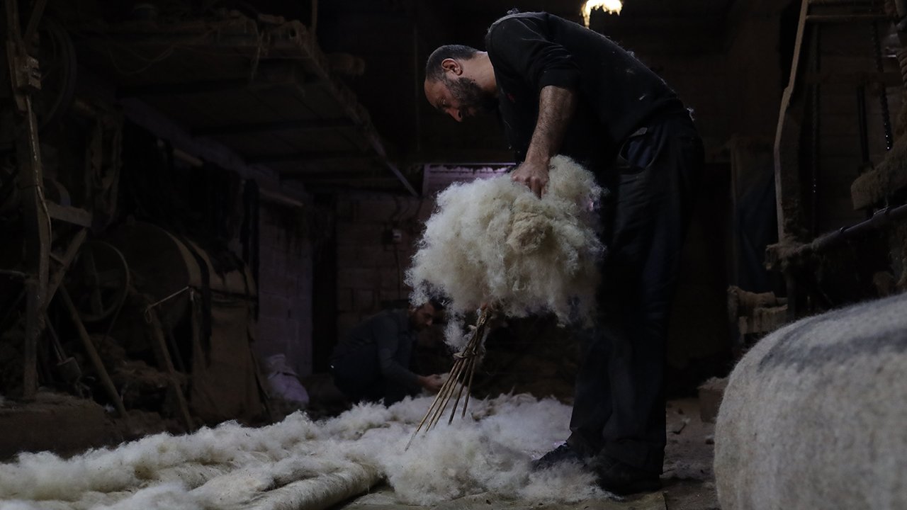 Tarihi kentte mesleğini sürdüren ustalar, koyun yününü geleneksel yöntemlerle işleyerek sanata dönüştürüyor.