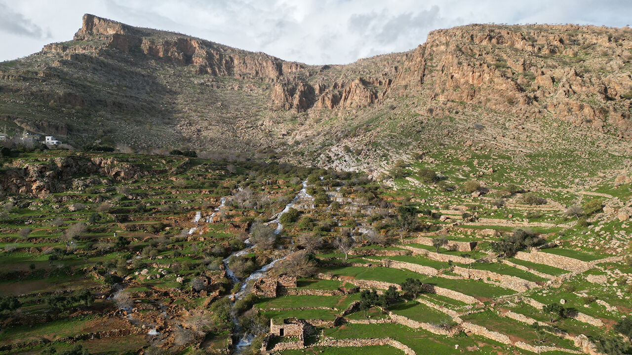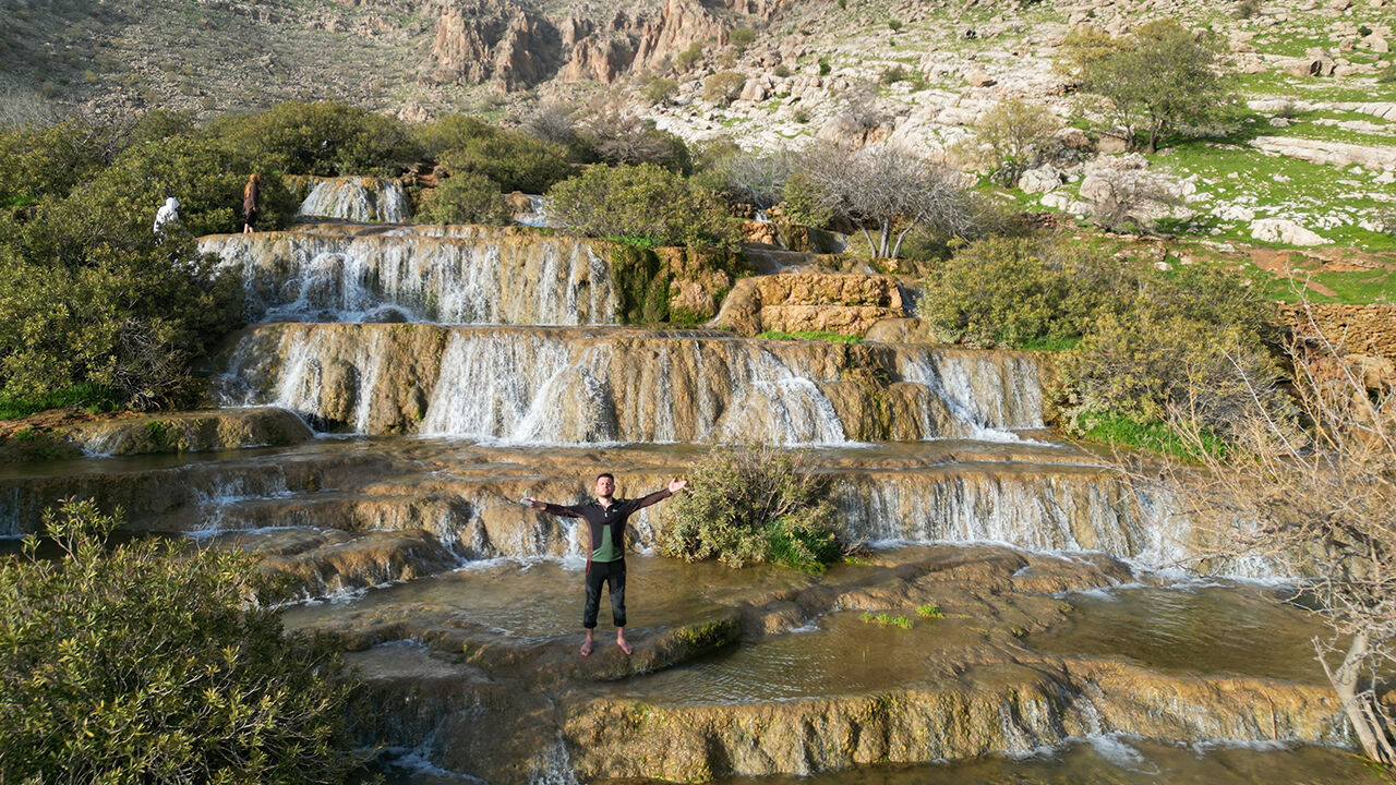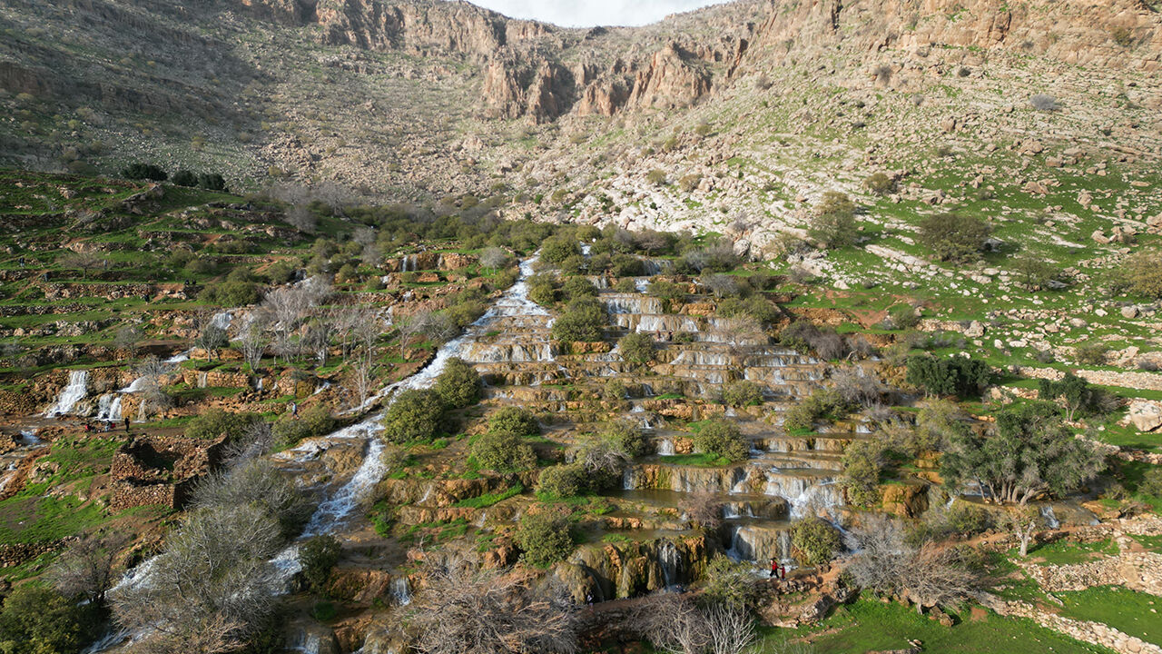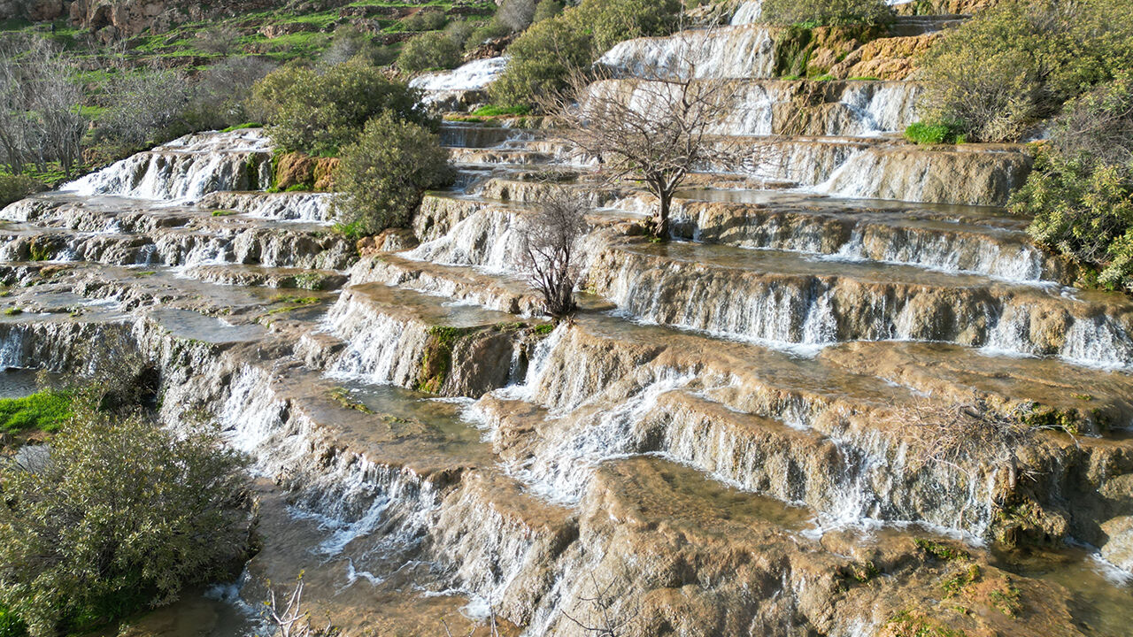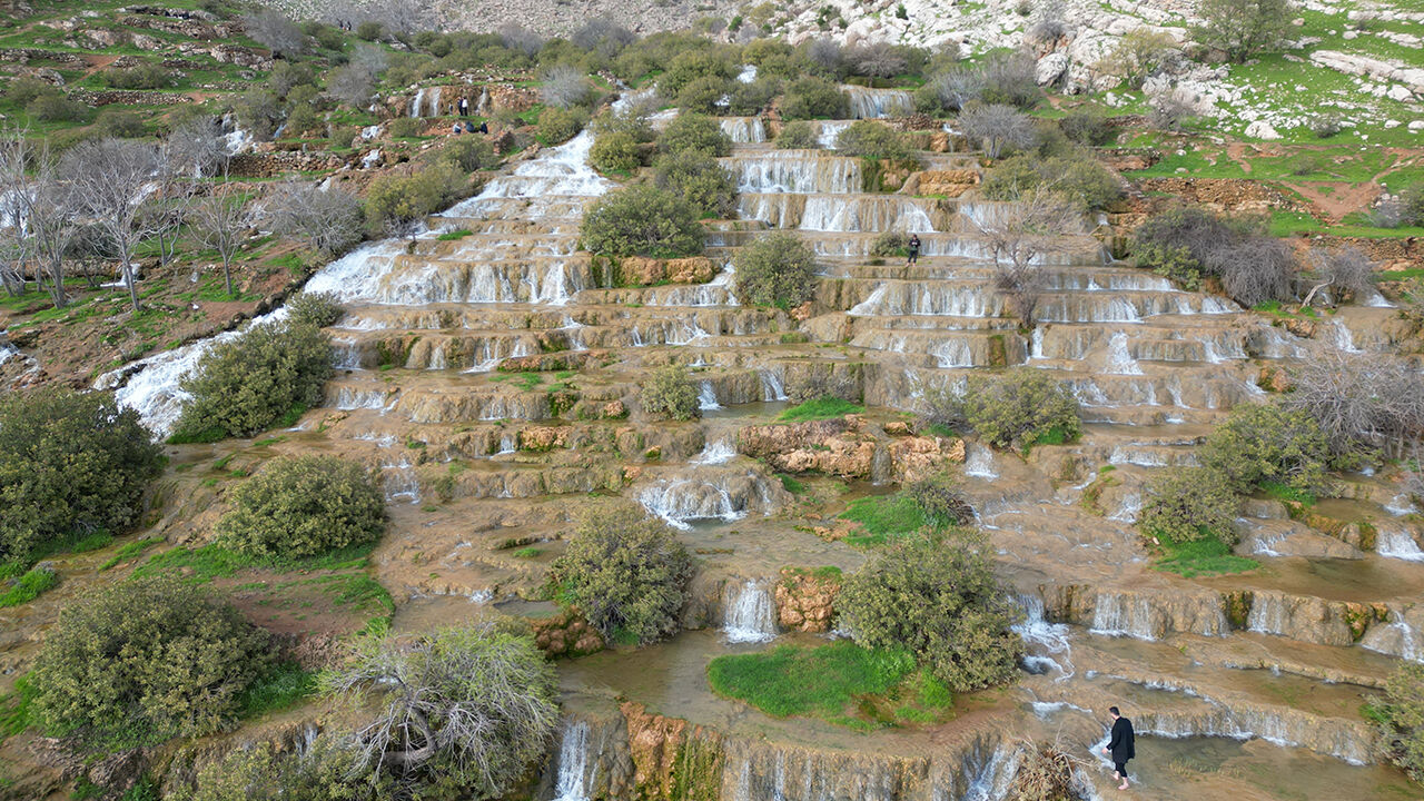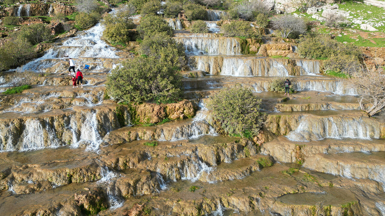 Mardin'in Kızıltepe ilçesinde "Emrud travertenleri" olarak bilinen su kaynağının oluşturduğu çağlayanlar ve şelaleler dronla görüntülendi.