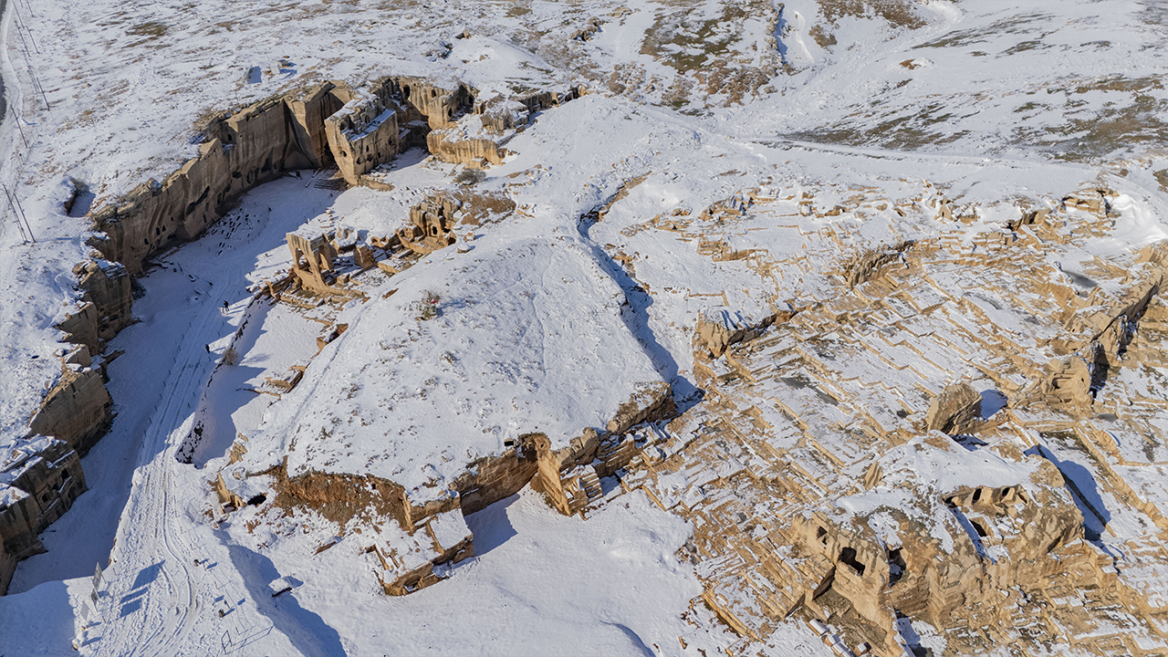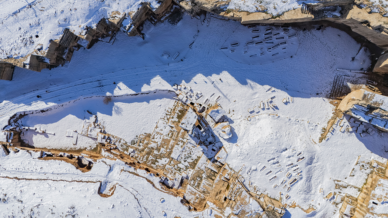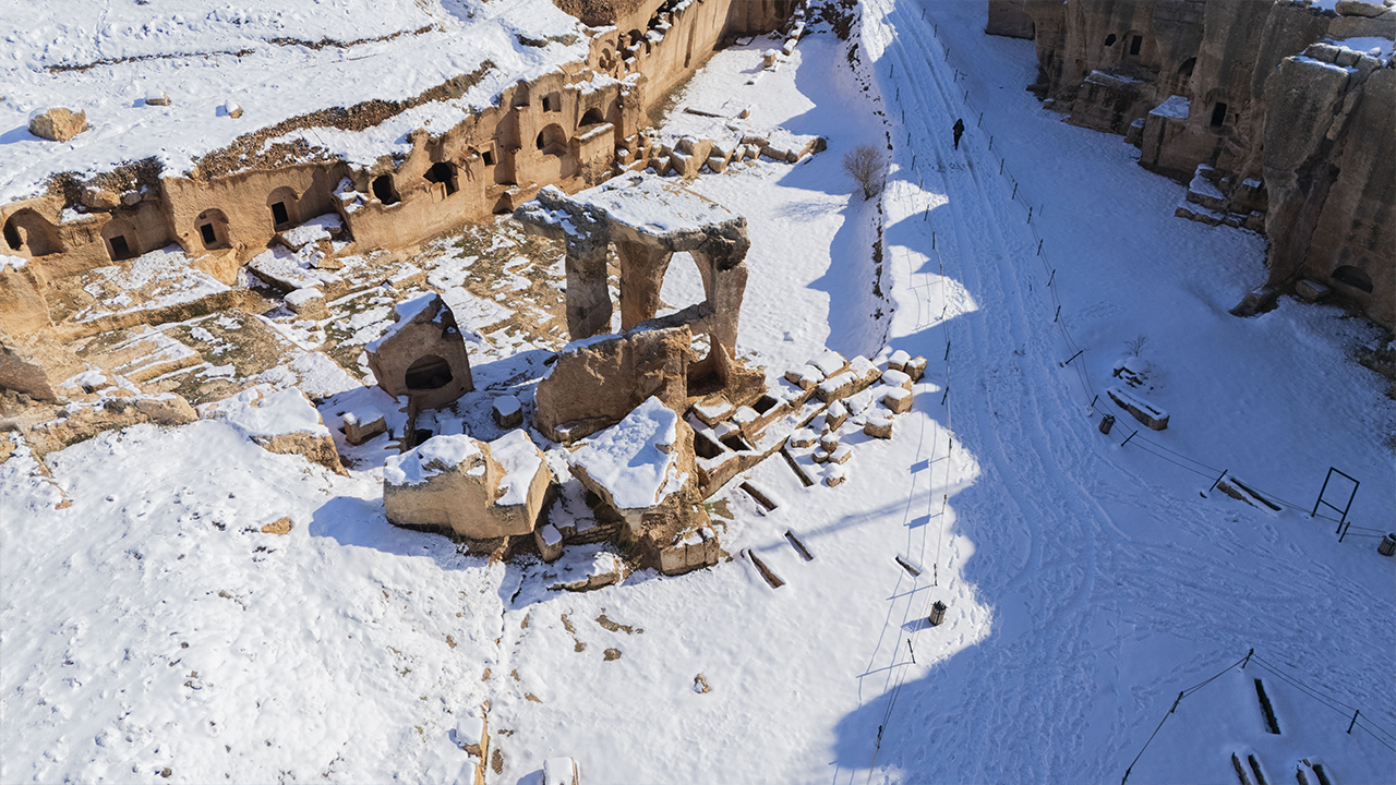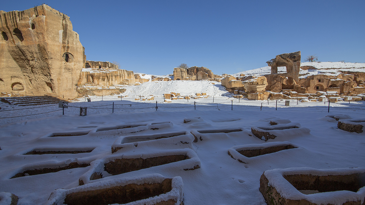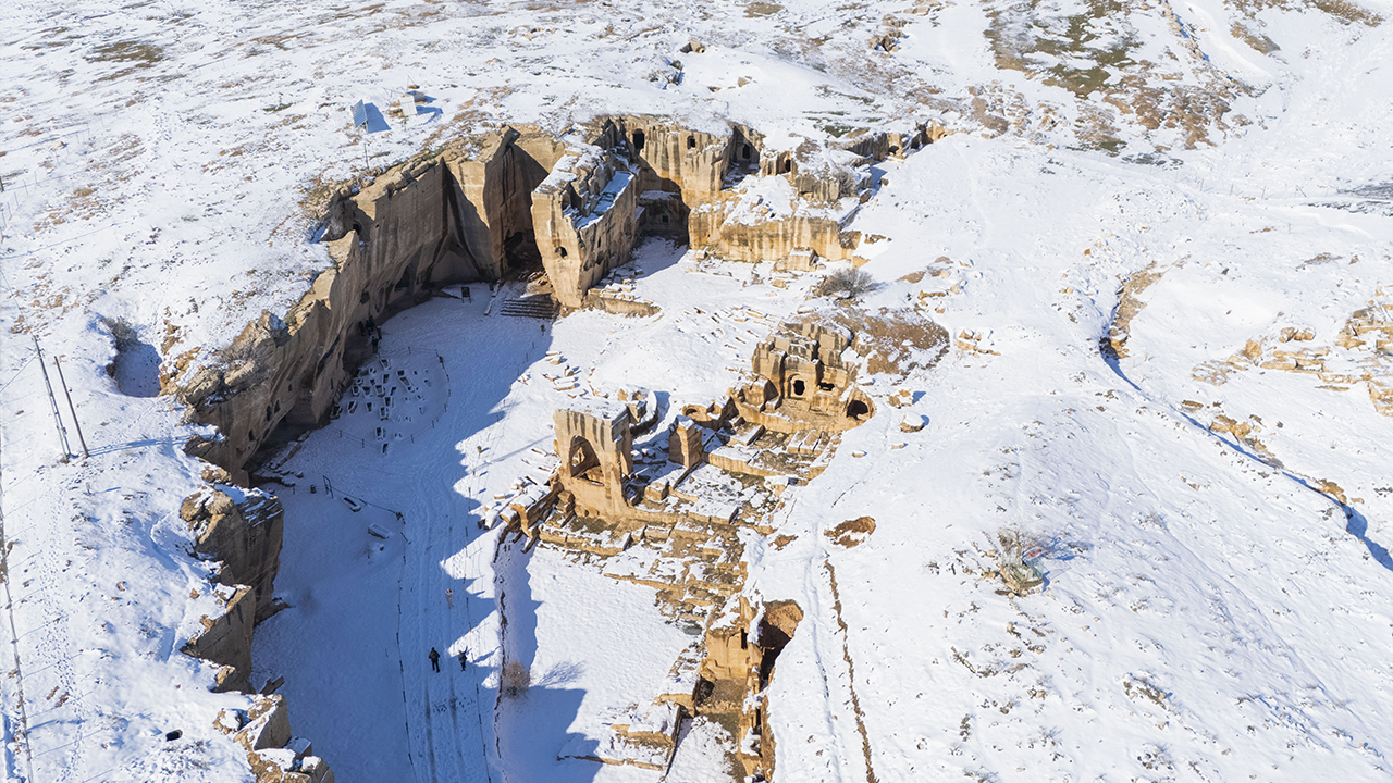Kent merkezine yaklaşık 32 kilometre uzaklıkta yer alan ve açık hava müzesi konumundaki antik kentte oluşan görüntüler dronla kaydedildi.