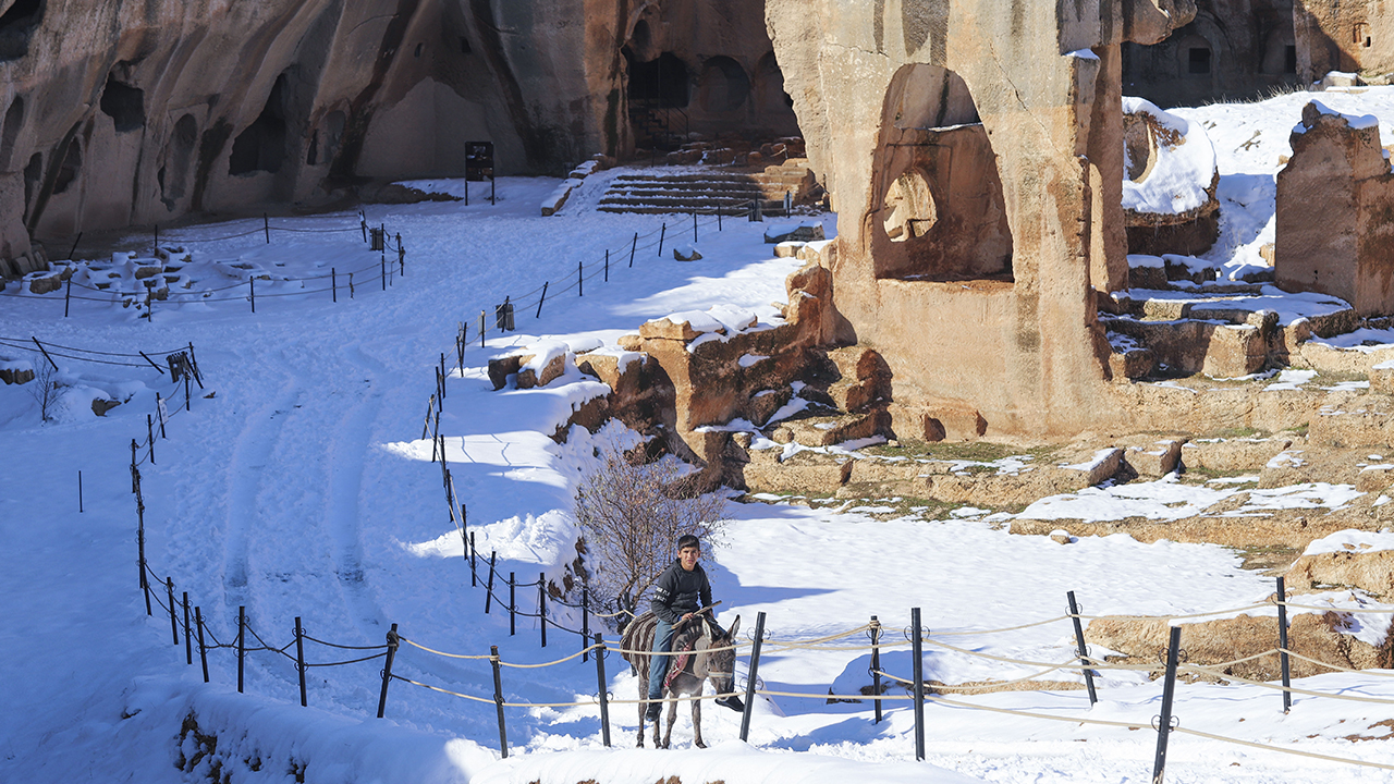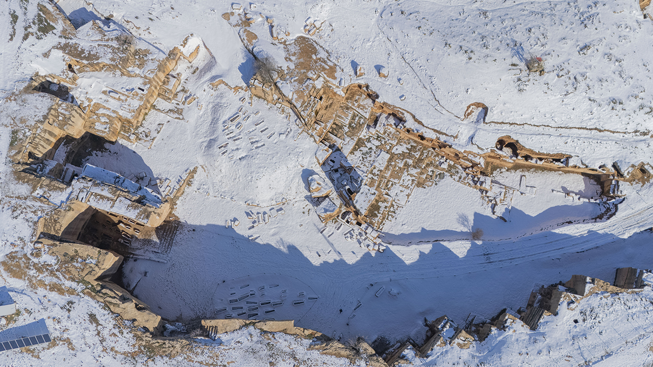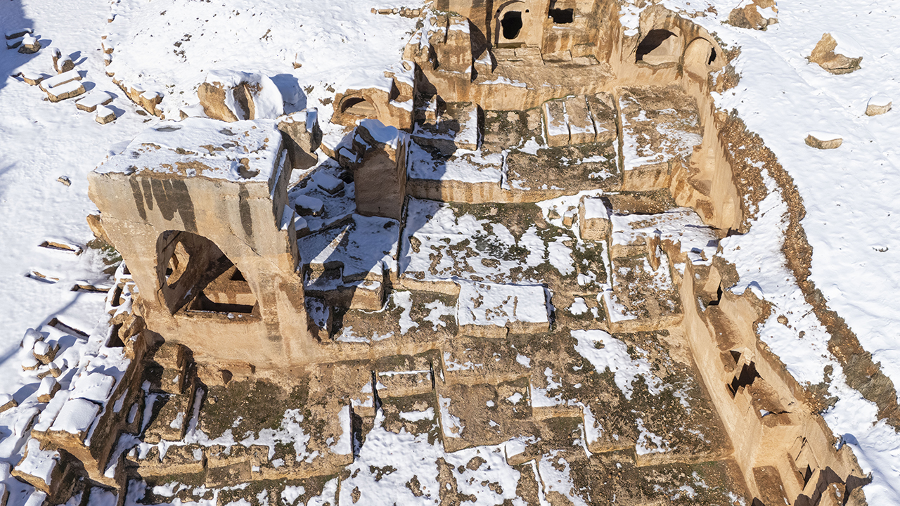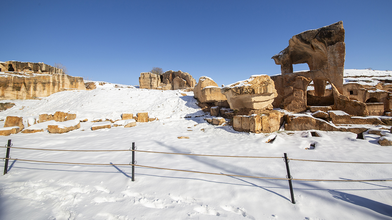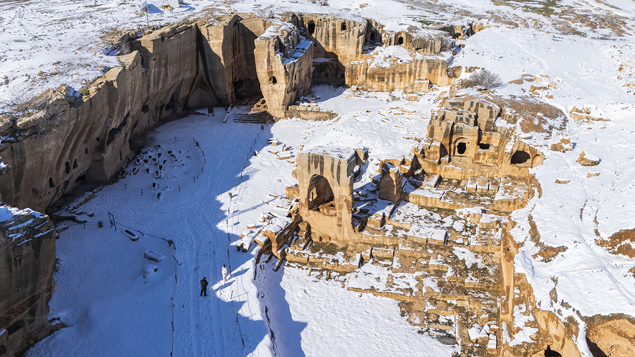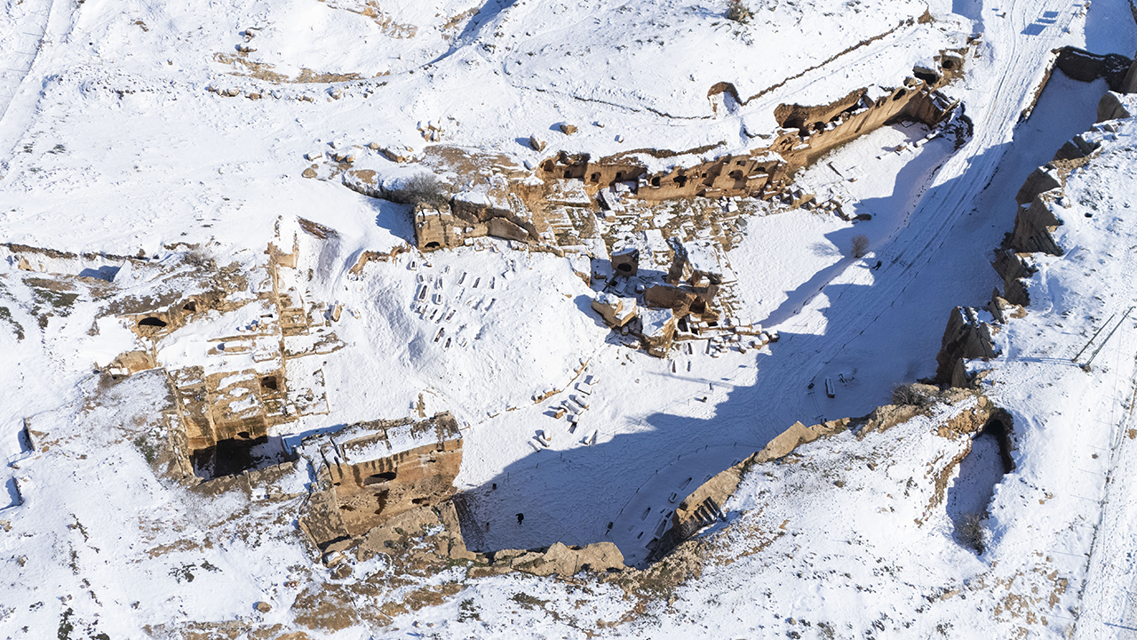 Kent merkezine yaklaşık 32 kilometre uzaklıkta yer alan ve açık hava müzesi konumundaki antik kentte oluşan görüntüler dronla kaydedildi.