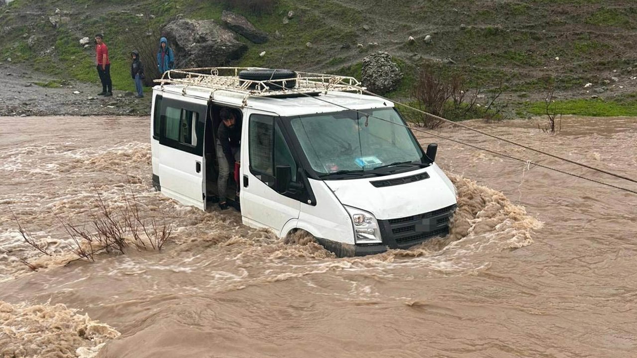 Yola çıkan minibüs, Veyselkarani beldesi yakınlarında yağış nedeniyle su seviyesi yükselen derede mahsur kaldı.