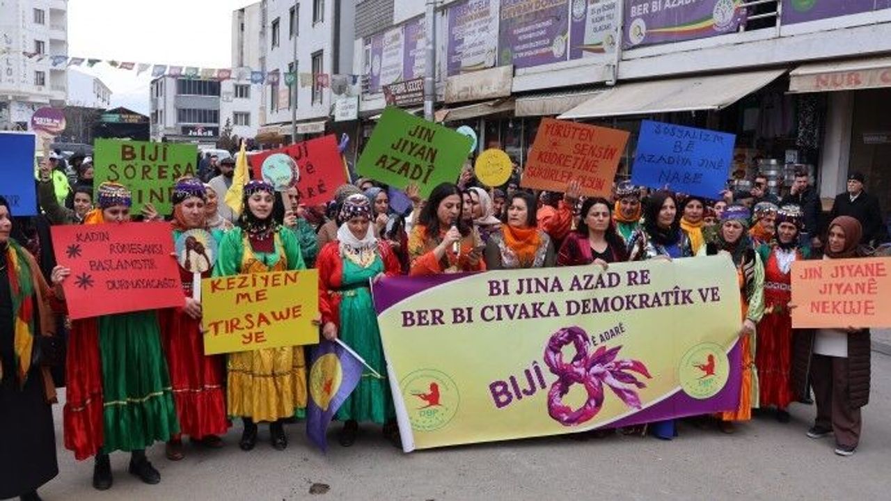 Burada konuşan DBP Kadın Meclisi Sözcüsü Berivan Bahçeci, günlerdir 8 Mart yürüyüşü için köy köy, mahalle mahalle dolaşarak kadınları alanlara davet ettiklerini belirterek, "Bunu kadınların bir araya gelmesi, seslerini sokaklarda ve meydanlarda duyurabilmesi için yaptık. Kadınların haklarını savunması ve birlikte güçlenmesi için yaptık. Polis yürüyüşümüze izin vermedi. Gerekçe olarak pankart ve dövizlerimizi indirmemizi istediler. ‘Jin, jiyan, azadî’ diyeceğimiz için saatlerdir etrafımız sarıldı. Kadınların alana gelmesine ve sesini yükseltmesine engel olunuyor. Ancak biz hiçbir zaman kadının sesinin kısılmasına izin vermeyeceğiz” dedi.