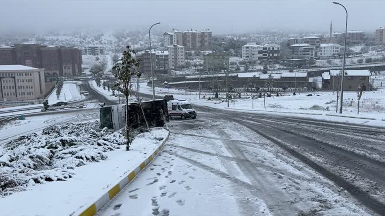 Abdullah Ağmanalmaz idaresindeki 50 EC 110 plakalı minibüs, Yavuz Sultan Selim Mahallesi Kayaşehir yolunda, kar yağışının ardından kayganlaşan yolda refüje çarparak devrildi. Kazada, sürücü ile araçtaki bims fabrikası çalışanı 13 işçi yaralandı.
